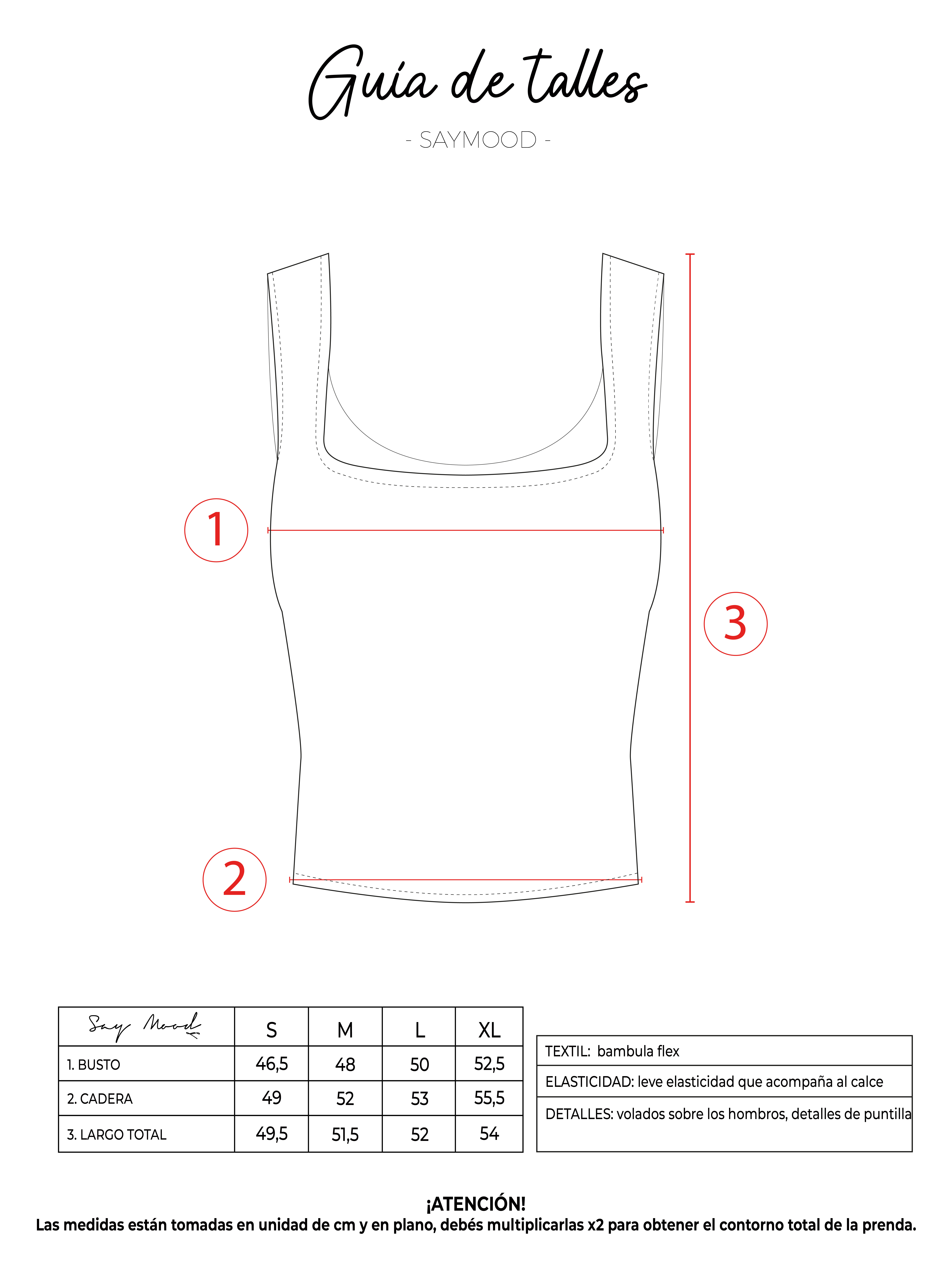 SAYTIPS: chequeá con atención nuestra tabla de talles para encontrar el que mejor vaya con vos. Podés tomar como referencia una prenda similar que tengas para mayor seguridad 😉