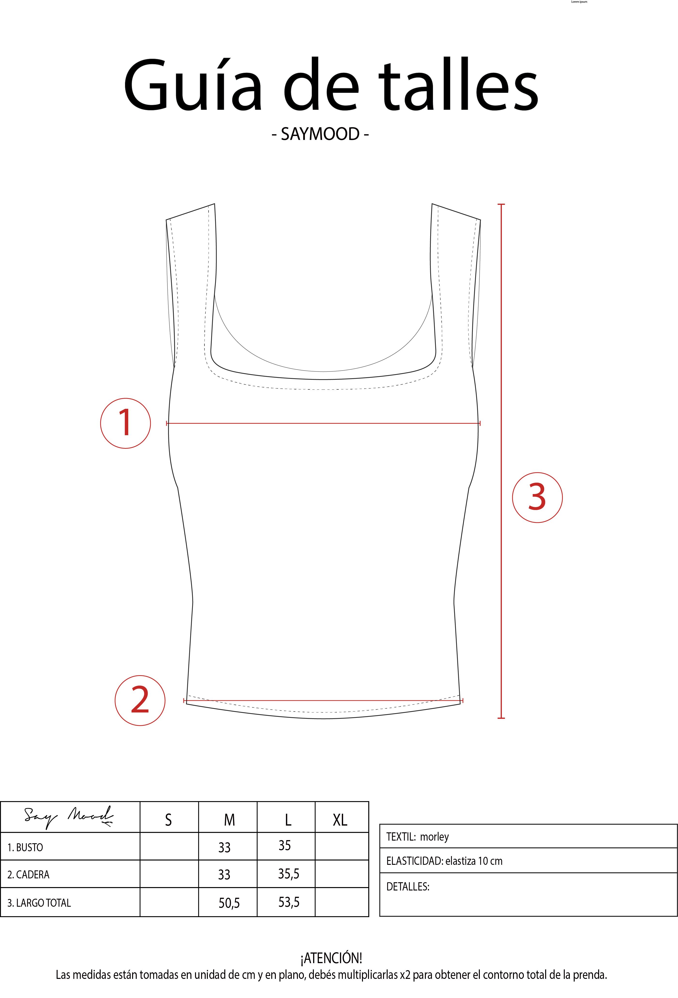 SAYTIPS: chequeá con atención nuestra tabla de talles para encontrar el que mejor vaya con vos. Podés tomar como referencia una prenda similar que tengas para mayor seguridad 😉