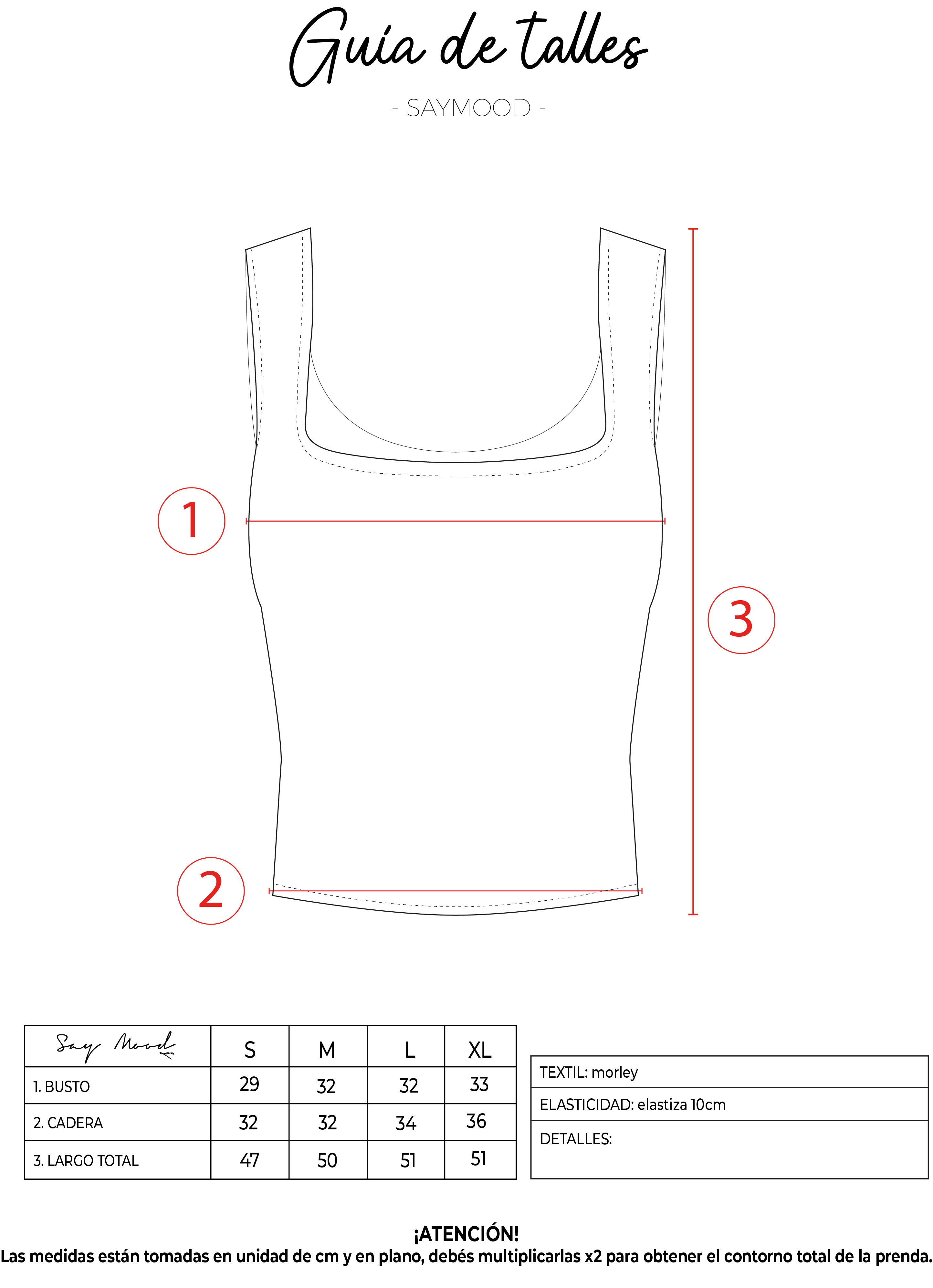 SAYTIPS: chequeá con atención nuestra tabla de talles para encontrar el que mejor vaya con vos. Podés tomar como referencia una prenda similar que tengas para mayor seguridad 😉
