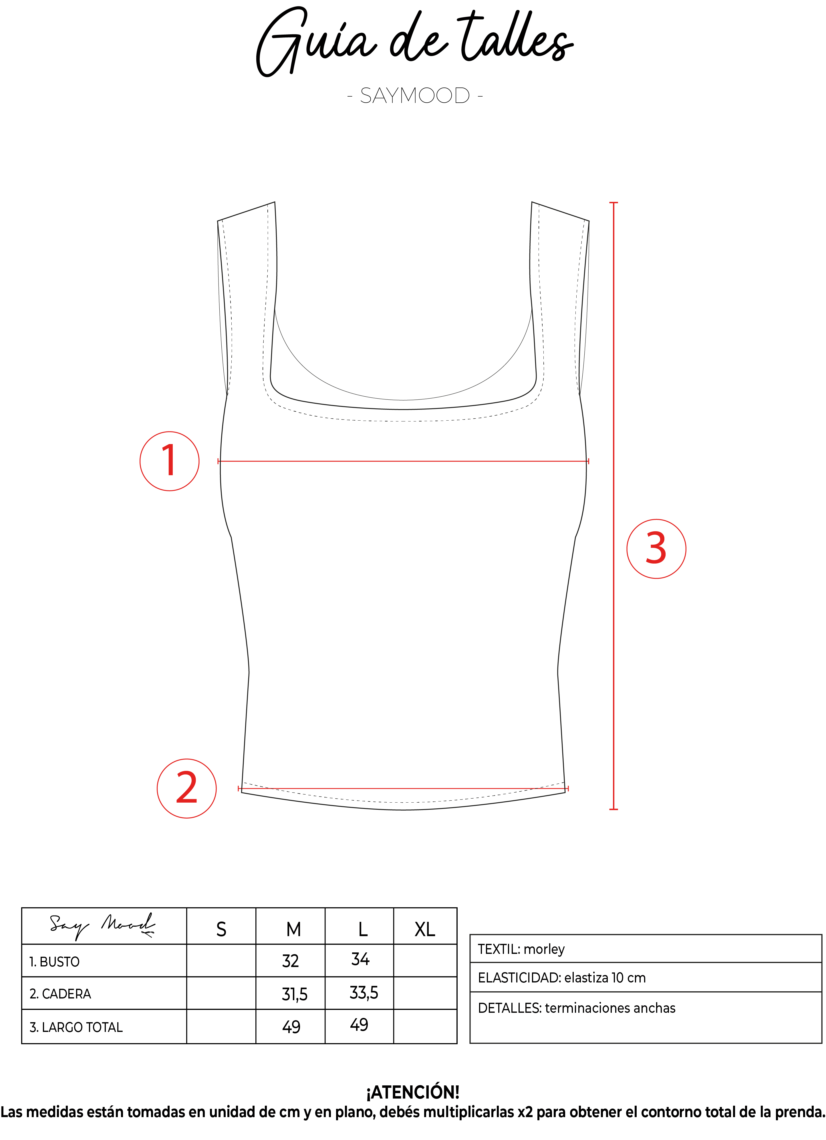 SAYTIPS: chequeá con atención nuestra tabla de talles para encontrar el que mejor vaya con vos. Podés tomar como referencia una prenda similar que tengas para mayor seguridad 😉
