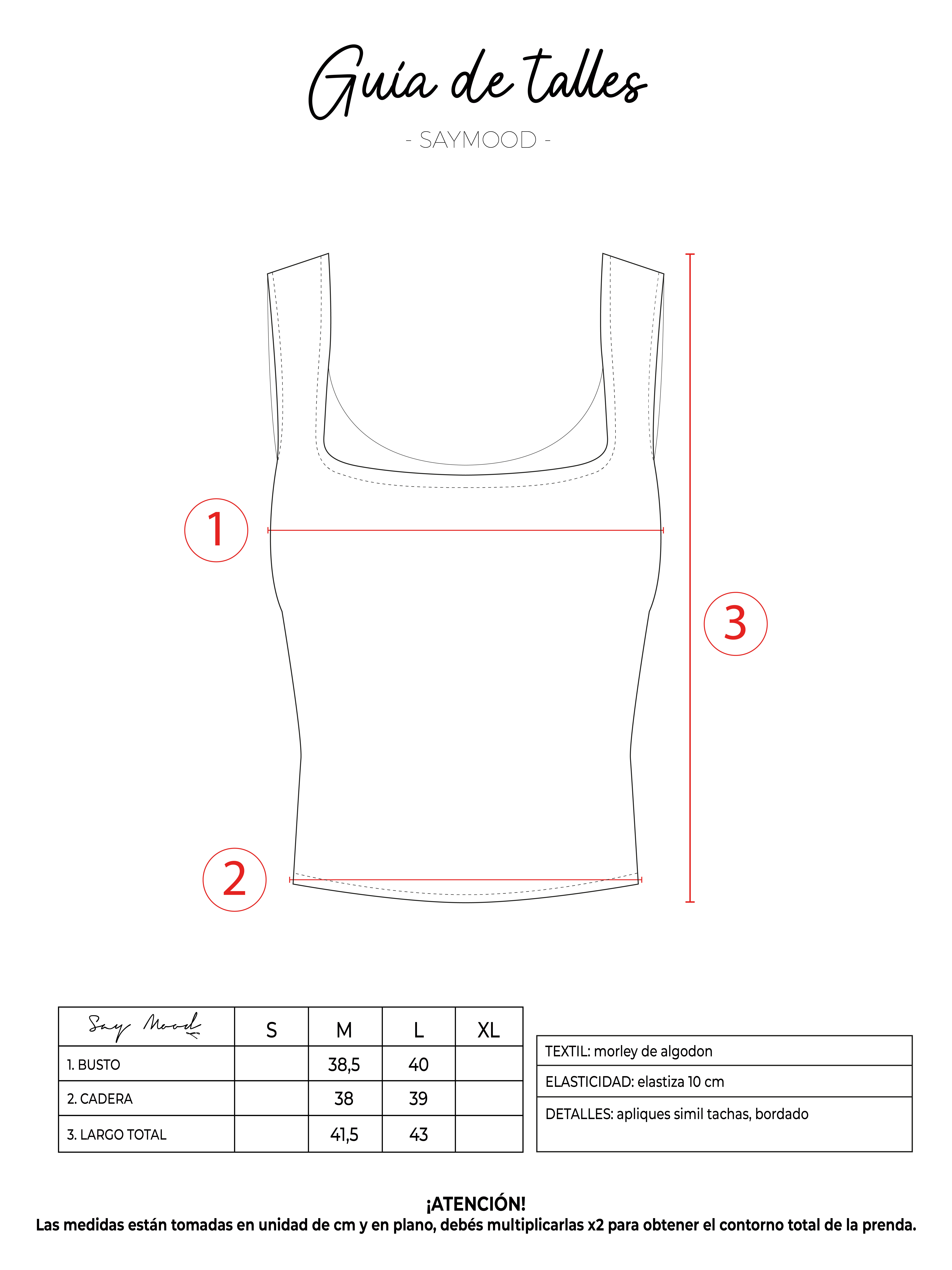 SAYTIPS: chequeá con atención nuestra tabla de talles para encontrar el que mejor vaya con vos. Podés tomar como referencia una prenda similar que tengas para mayor seguridad 😉