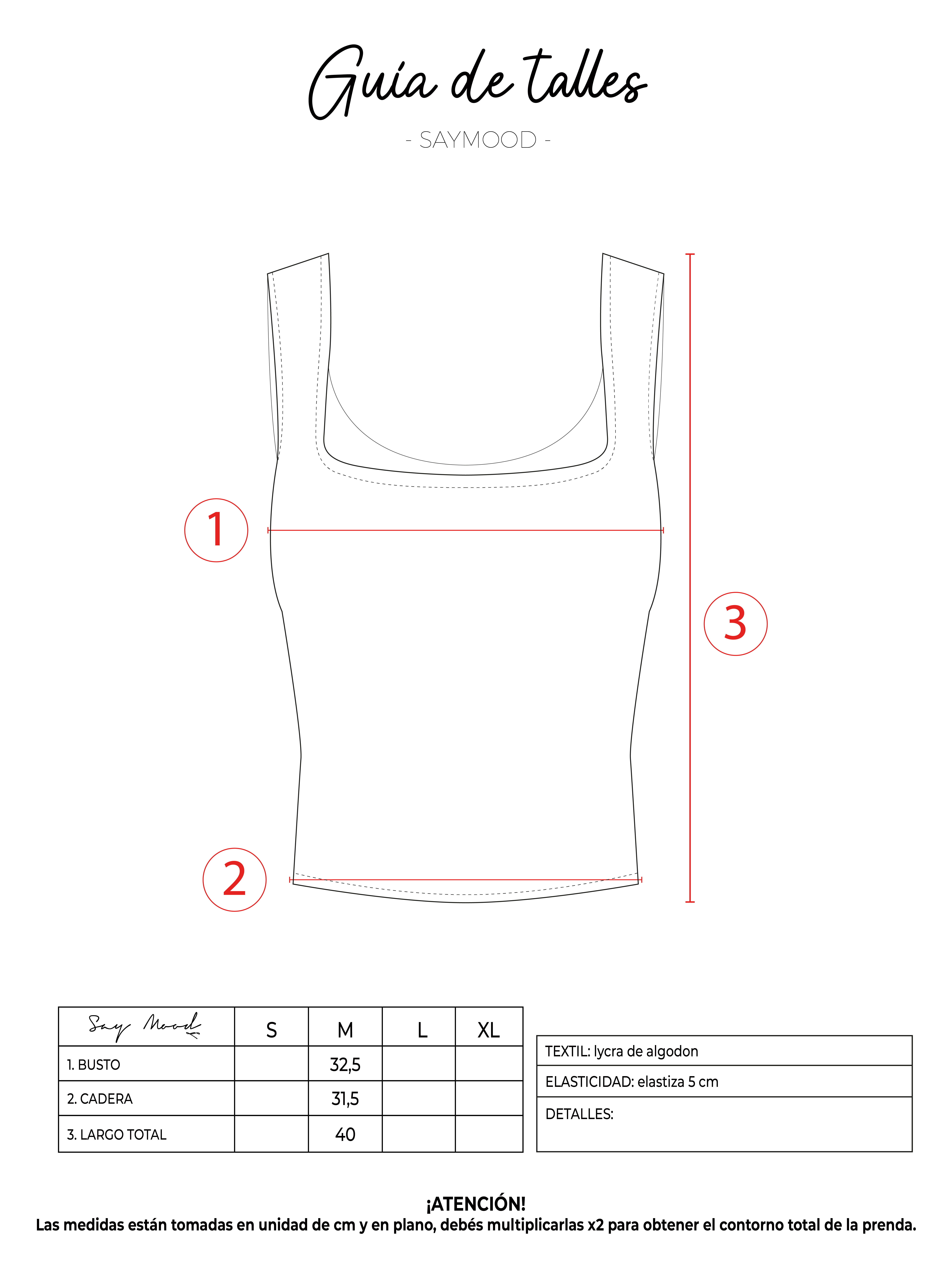 SAYTIPS: chequeá con atención nuestra tabla de talles para encontrar el que mejor vaya con vos. Podés tomar como referencia una prenda similar que tengas para mayor seguridad 😉