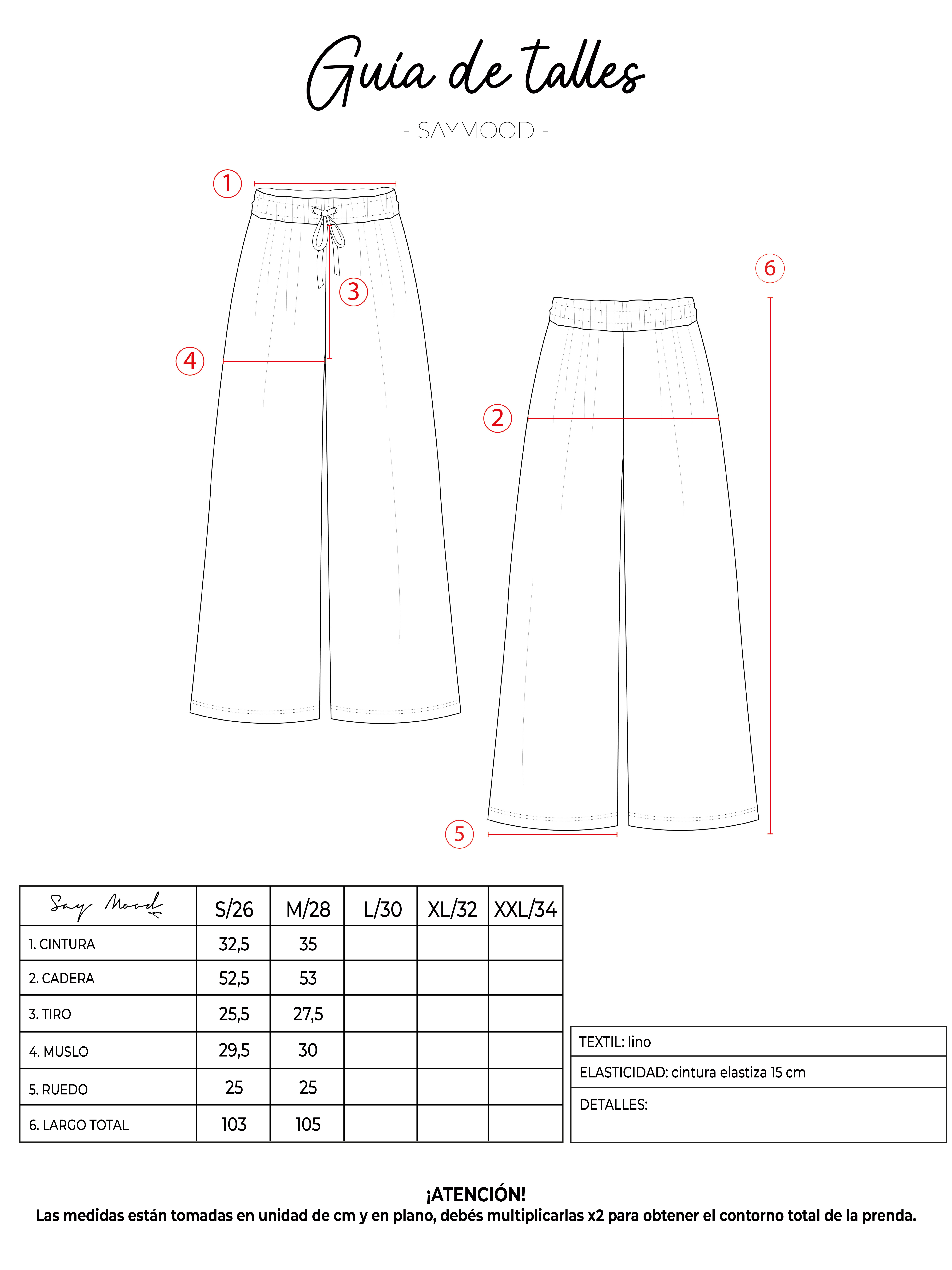SAYTIPS: chequeá con atención nuestra tabla de talles para encontrar el que mejor vaya con vos. Podés tomar como referencia una prenda similar que tengas para mayor seguridad 😉 hey! por naturaleza del textil, las prendas de lino pueden contener fibras de otro color en su tejido, viéndose como una linea un poco más oscura. No aceptamos reclamos relacionados, ya que no constituye una falla.