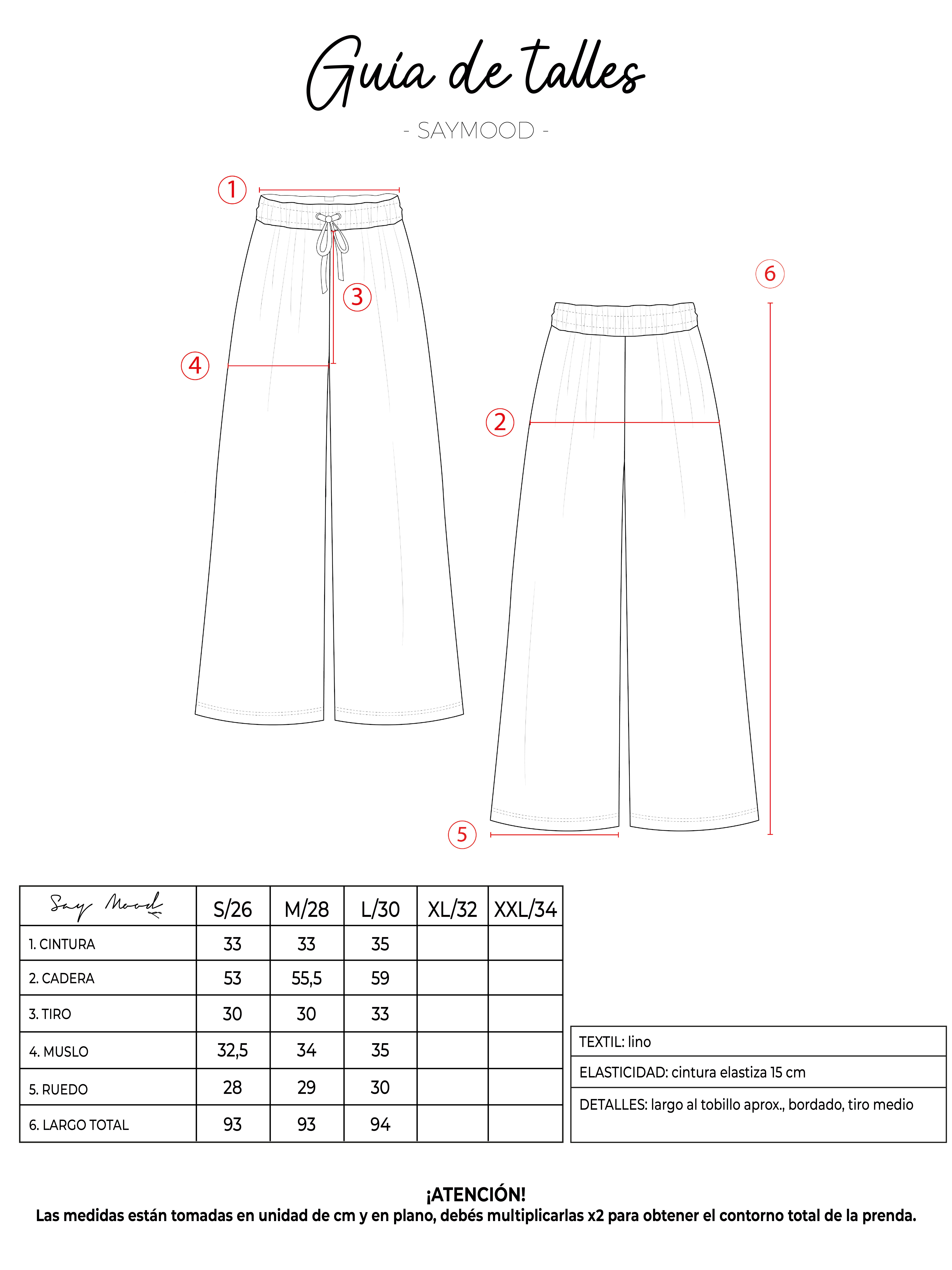 SAYTIPS: chequeá con atención nuestra tabla de talles para encontrar el que mejor vaya con vos. Podés tomar como referencia una prenda similar que tengas para mayor seguridad 😉 hey! por naturaleza del textil, las prendas de lino pueden contener fibras de otro color en su tejido, viéndose como una linea un poco más oscura. No aceptamos reclamos relacionados, ya que no constituye una falla.