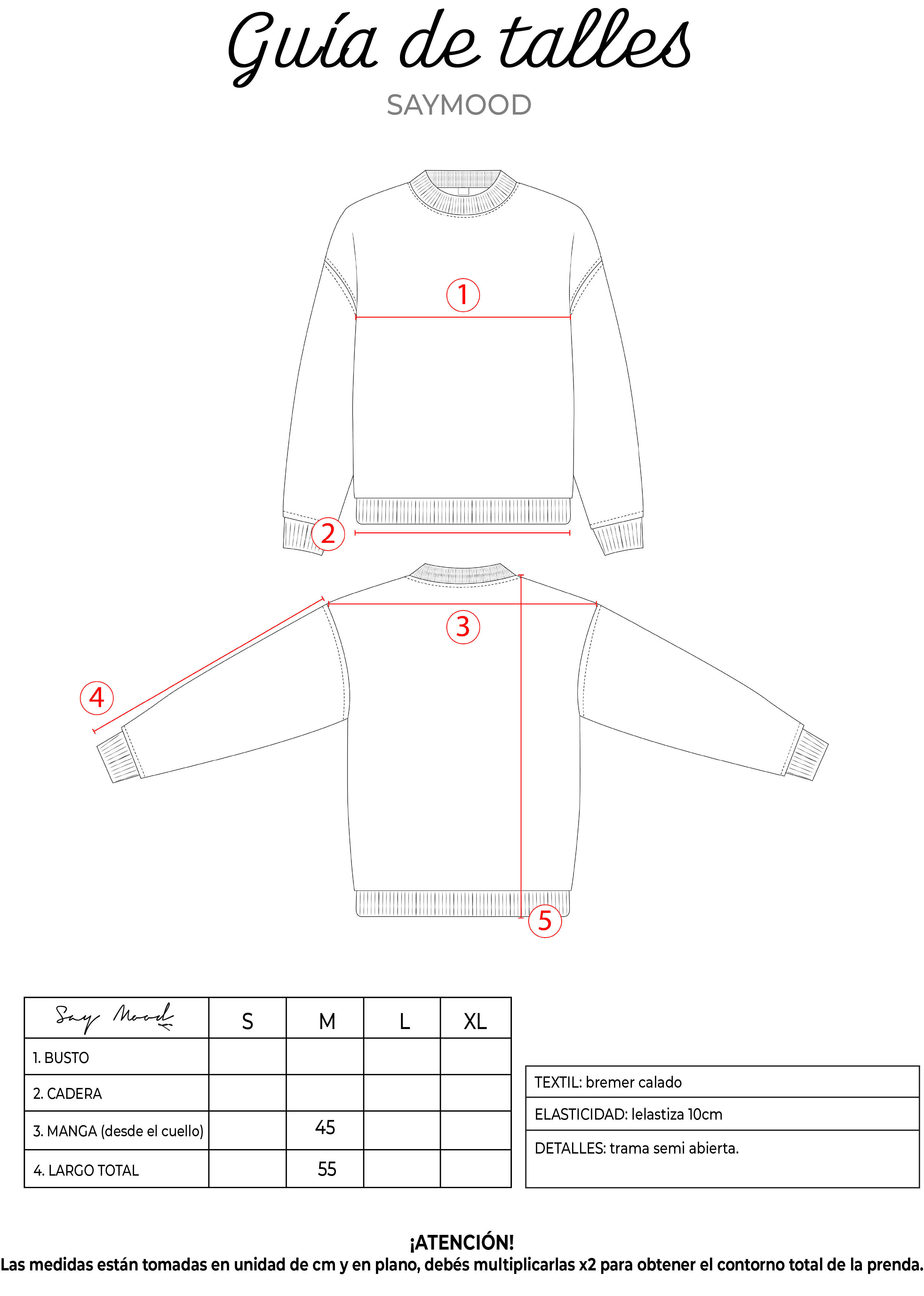 SAYTIPS: chequeá con atención nuestra tabla de talles para encontrar el que mejor vaya con vos. Podés tomar como referencia una prenda similar que tengas para mayor seguridad 😉