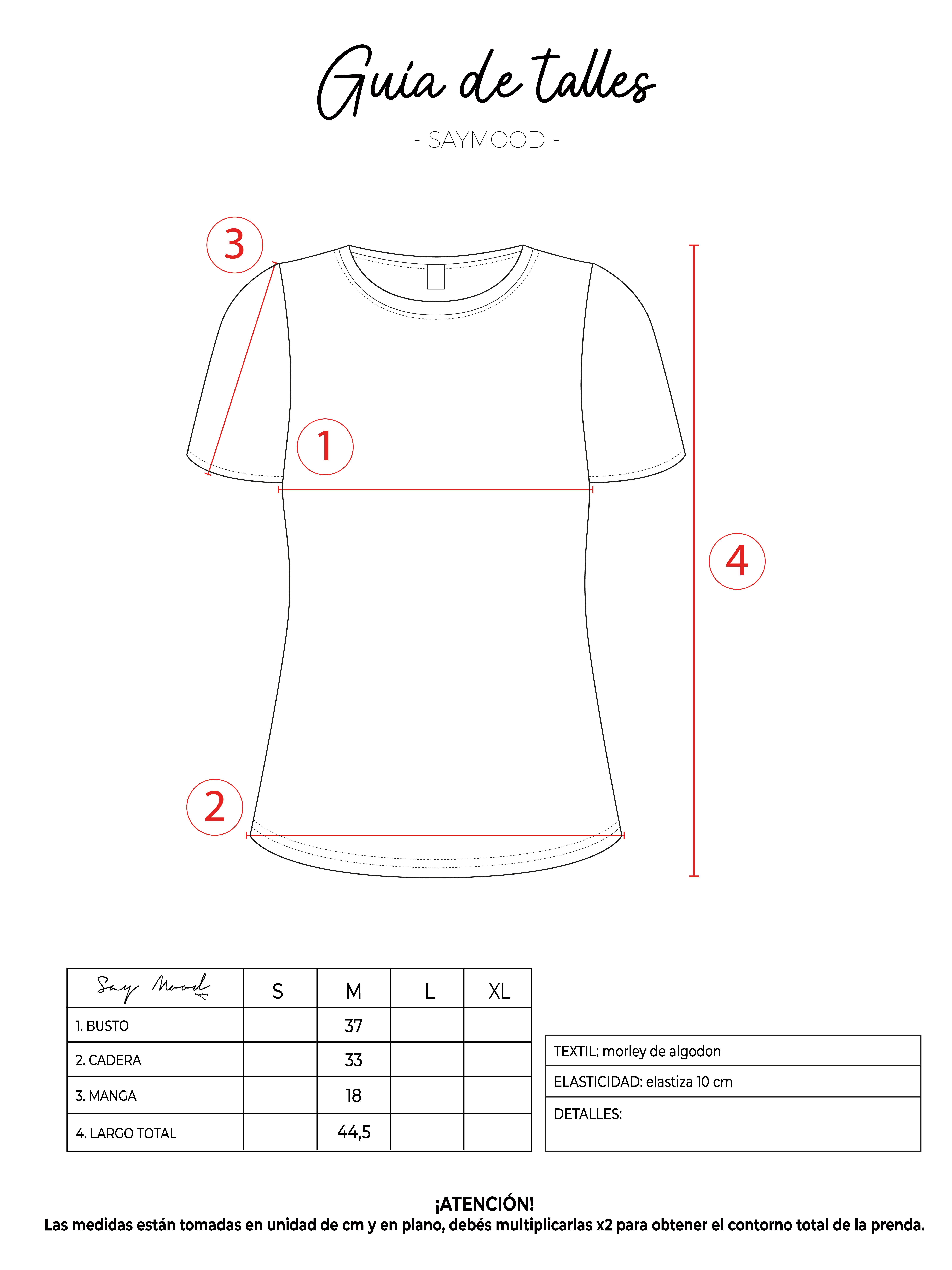 SAYTIPS: chequeá con atención nuestra tabla de talles para encontrar el que mejor vaya con vos. Podés tomar como referencia una prenda similar que tengas para mayor seguridad 😉
