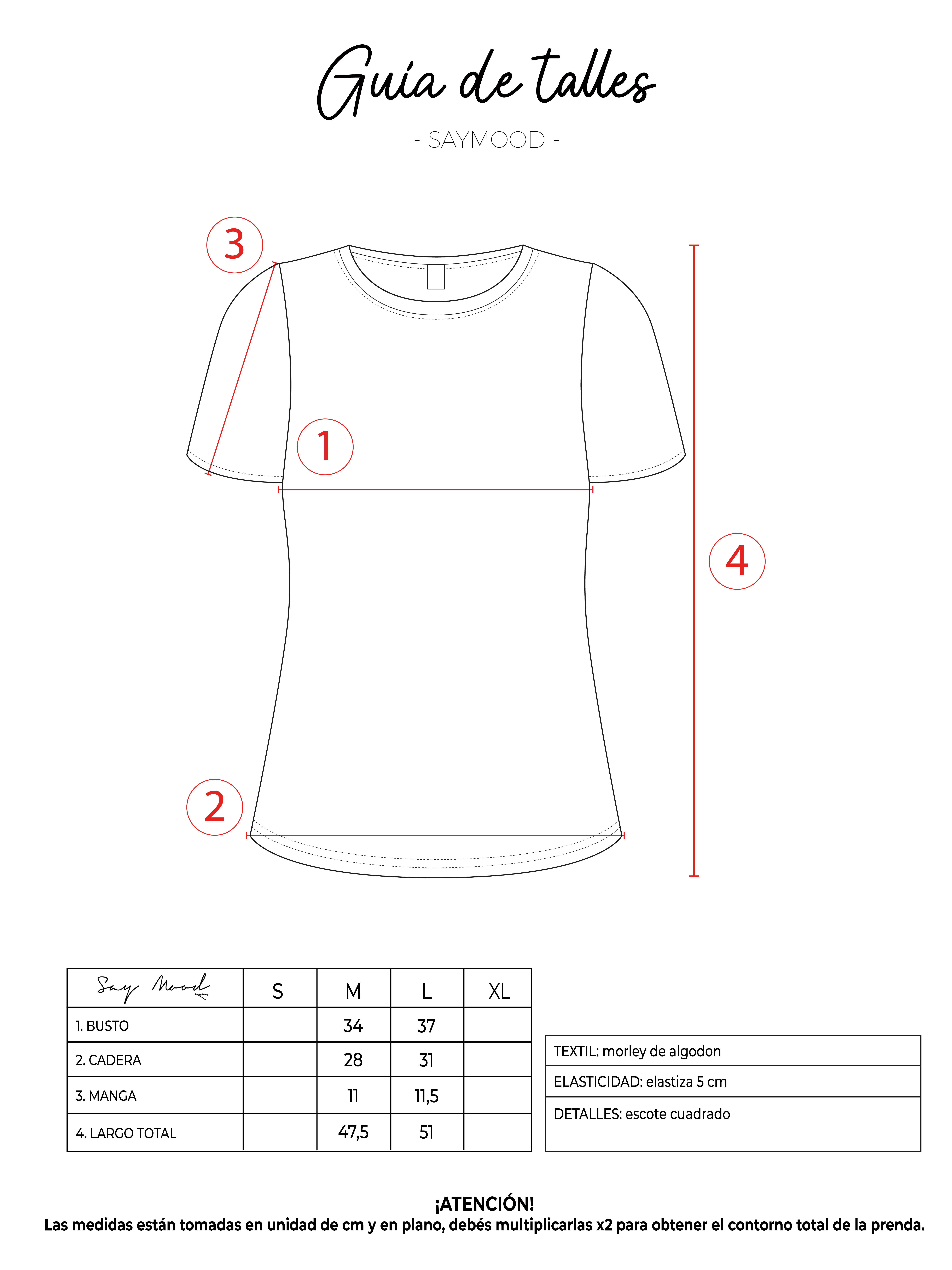 SAYTIPS: chequeá con atención nuestra tabla de talles para encontrar el que mejor vaya con vos. Podés tomar como referencia una prenda similar que tengas para mayor seguridad 😉