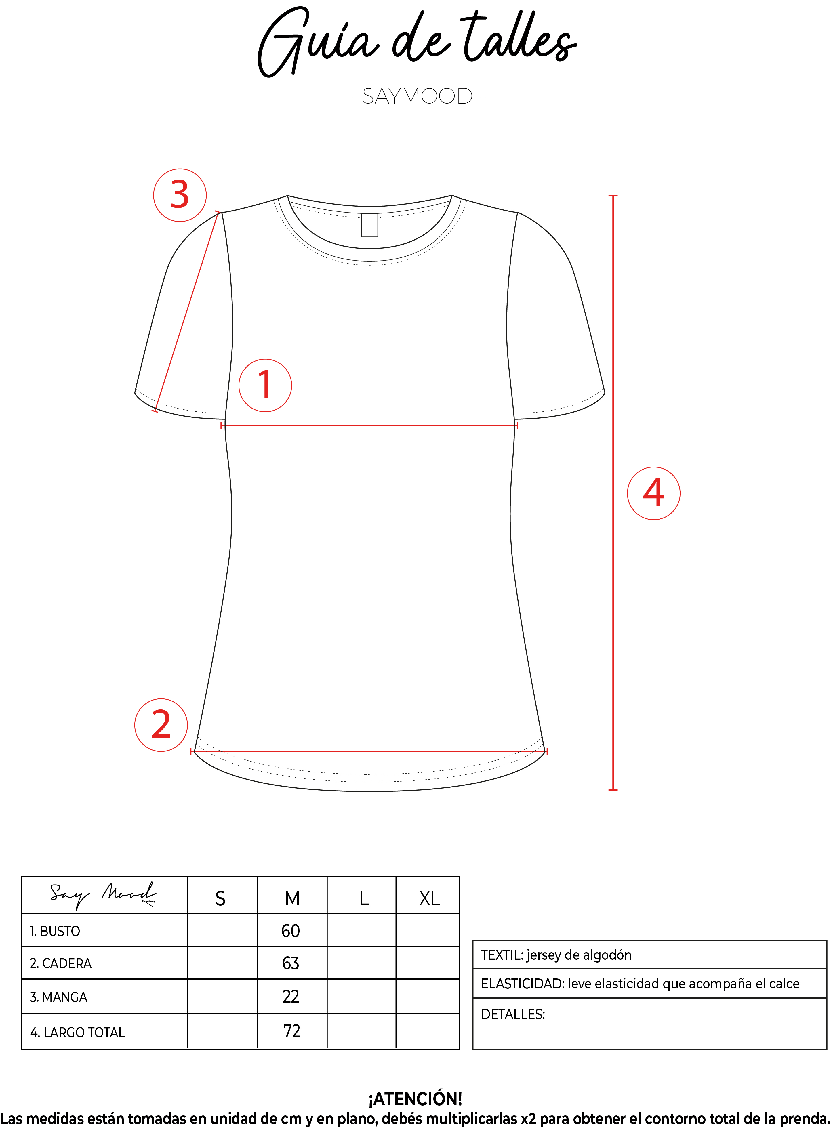 SAYTIPS: chequeá con atención nuestra tabla de talles para encontrar el que mejor vaya con vos. Podés tomar como referencia una prenda similar que tengas para mayor seguridad 😉