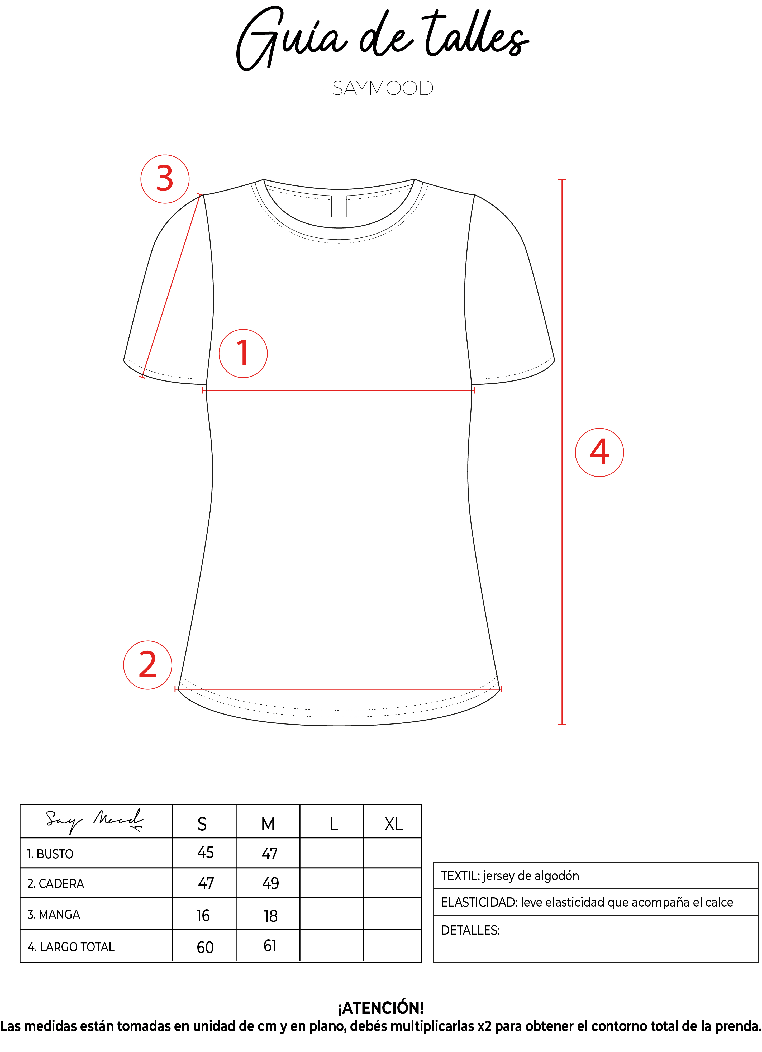 SAYTIPS: chequeá con atención nuestra tabla de talles para encontrar el que mejor vaya con vos. Podés tomar como referencia una prenda similar que tengas para mayor seguridad.