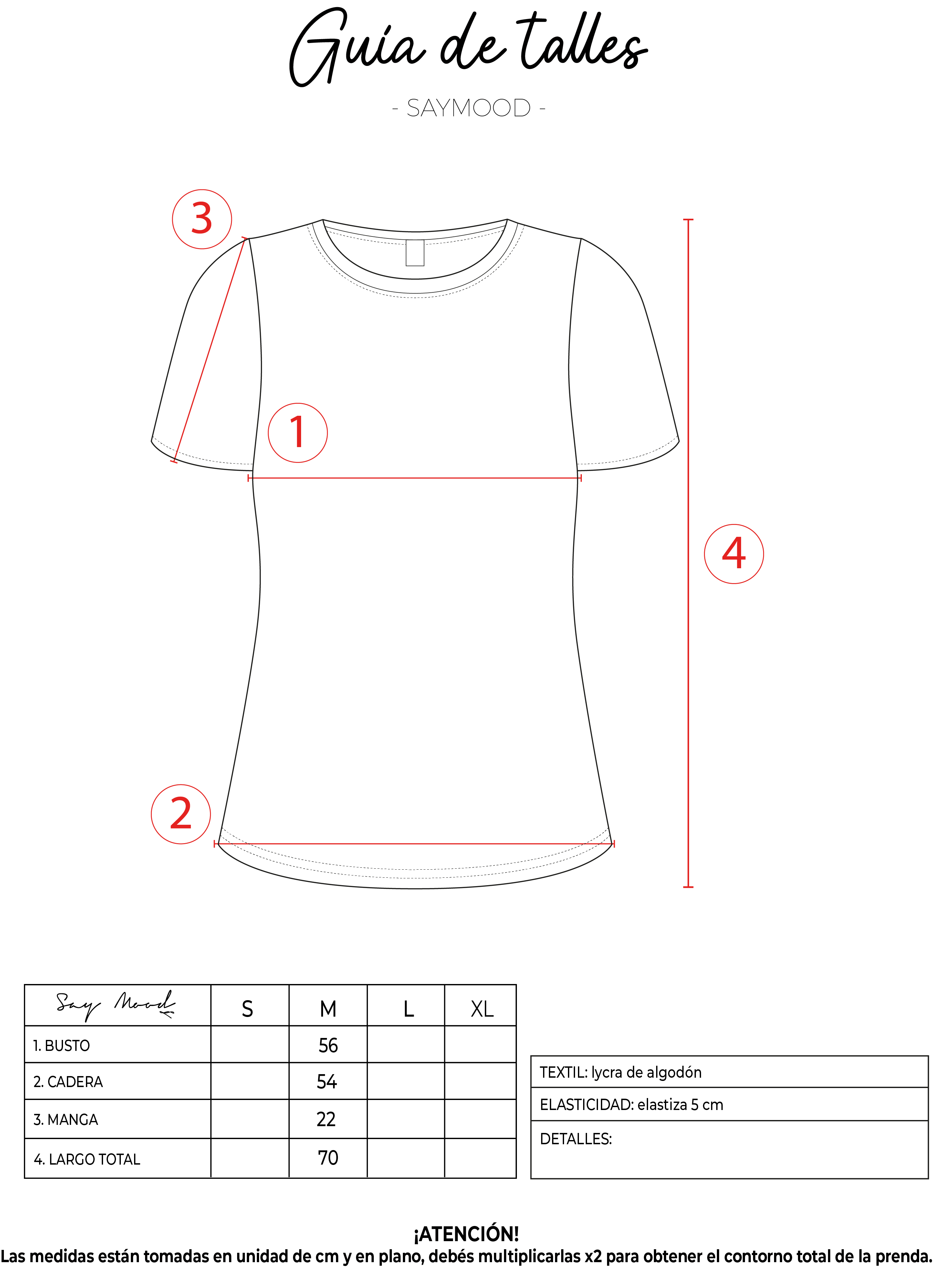 SAYTIPS: chequeá con atención nuestra tabla de talles para encontrar el que mejor vaya con vos. Podés tomar como referencia una prenda similar que tengas para mayor seguridad 😉