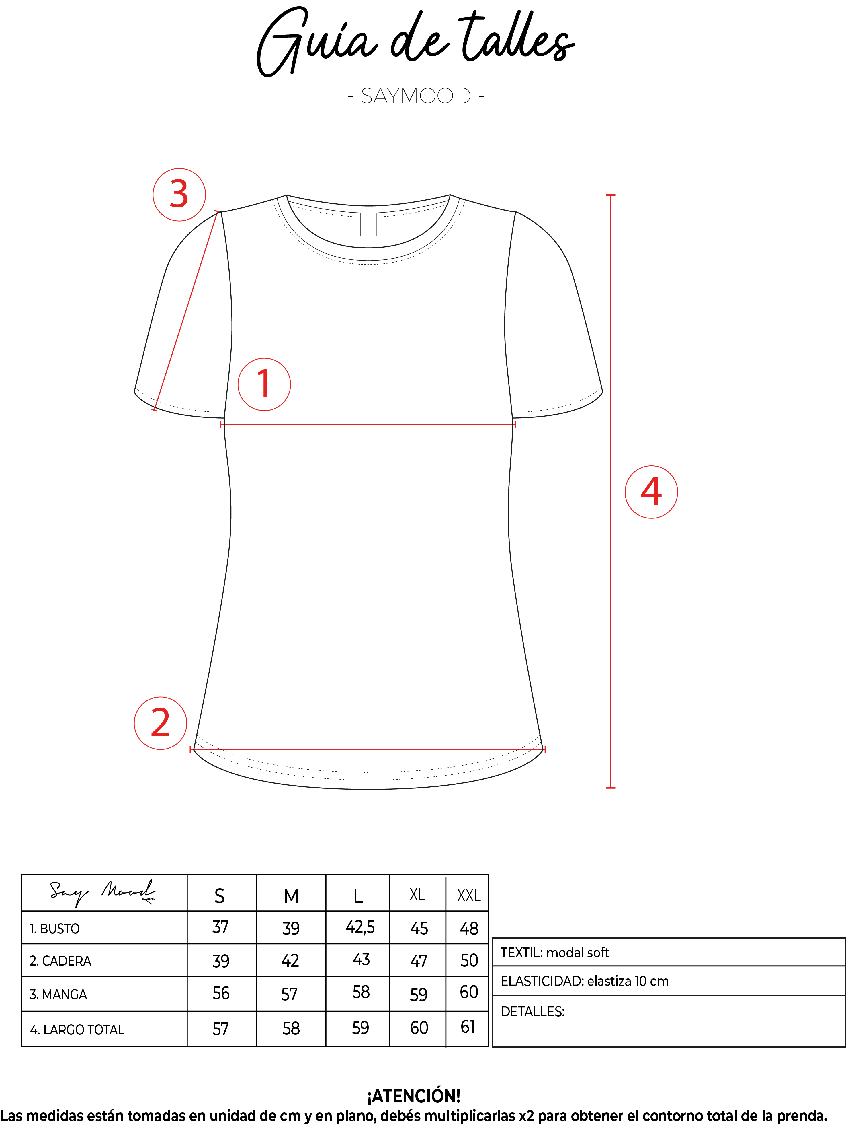 SAYTIPS: chequeá con atención nuestra tabla de talles para encontrar el que mejor vaya con vos. Podés tomar como referencia una prenda similar que tengas para mayor seguridad 😉