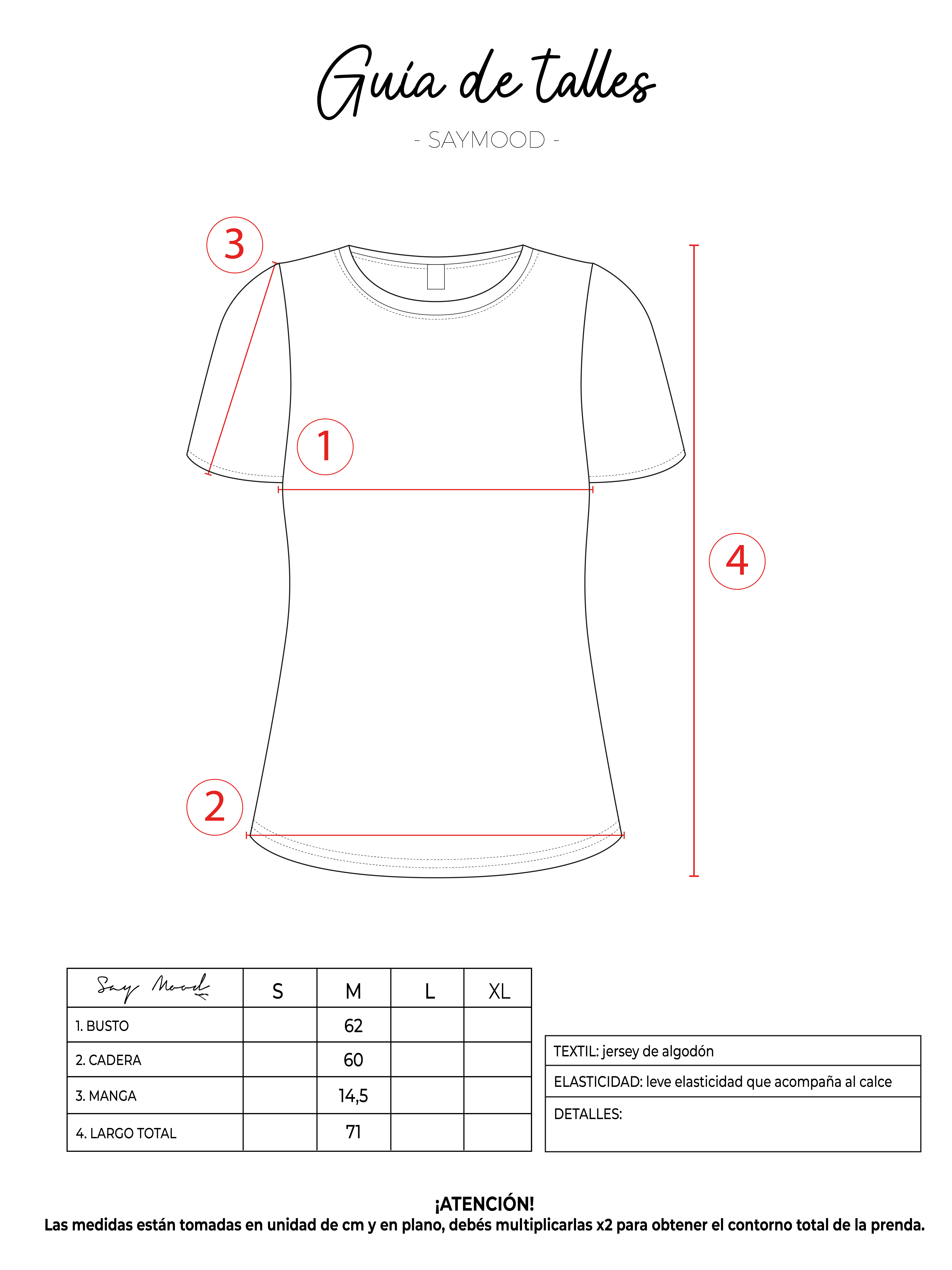 SAYTIPS: chequeá con atención nuestra tabla de talles para encontrar el que mejor vaya con vos. Podés tomar como referencia una prenda similar que tengas para mayor seguridad 😉