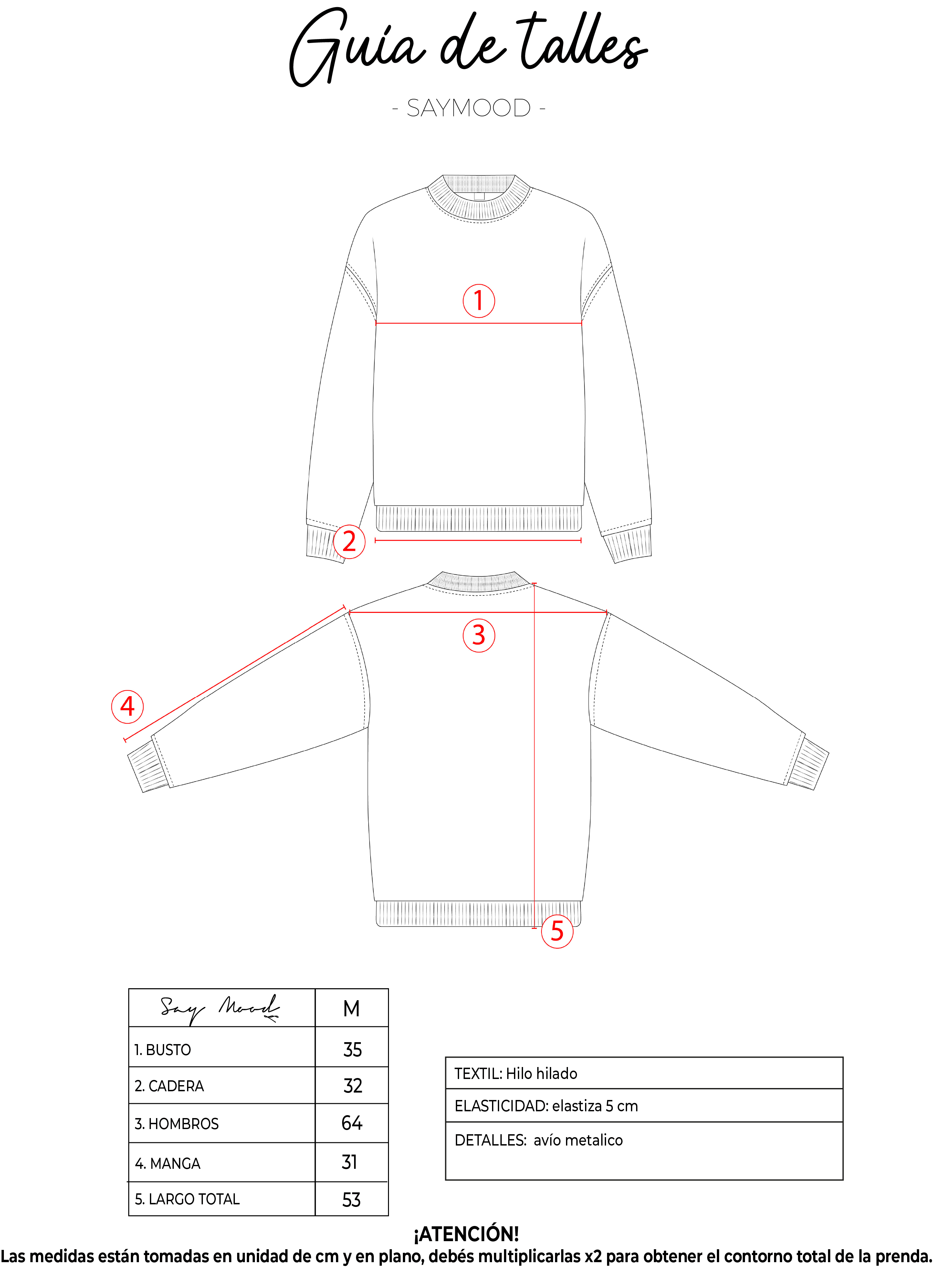 SAYTIPS: chequeá con atención nuestra tabla de talles para encontrar el que mejor vaya con vos. Podés tomar como referencia una prenda similar que tengas para mayor seguridad 😉