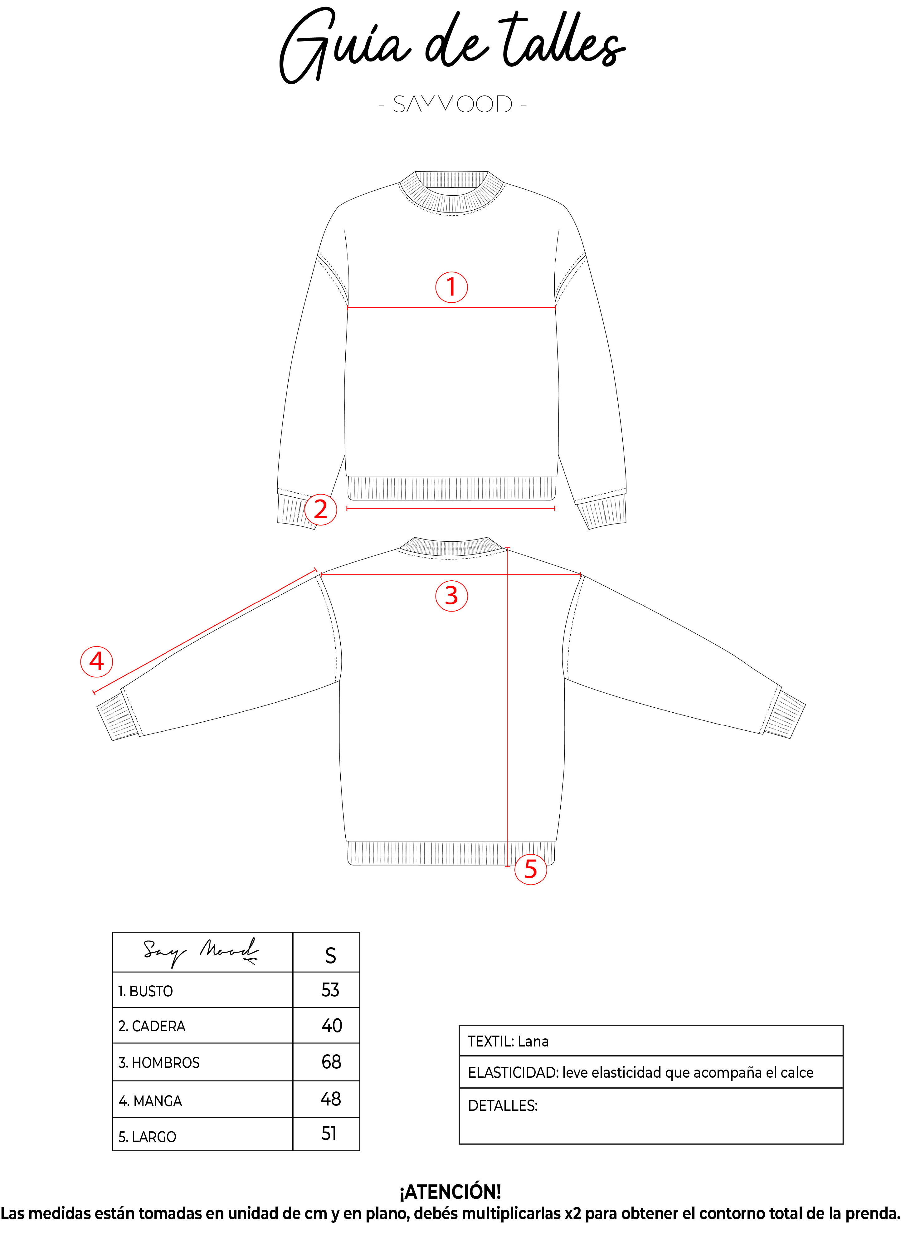 SAYTIPS: chequeá con atención nuestra tabla de talles para encontrar el que mejor vaya con vos. Podés tomar como referencia una prenda similar que tengas para mayor seguridad.