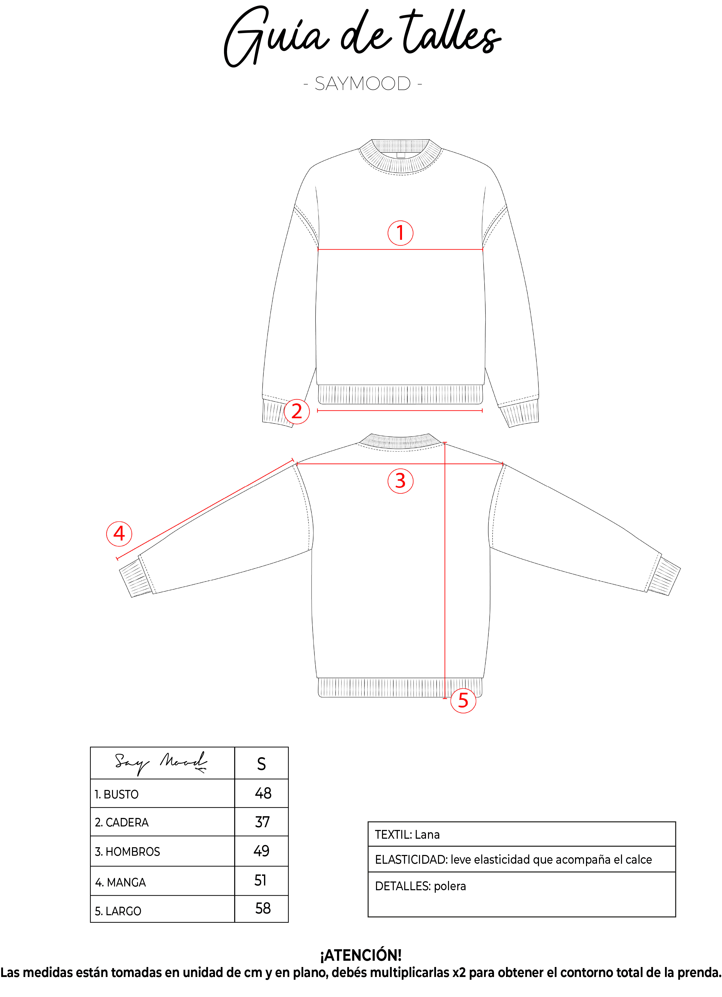 SAYTIPS: chequeá con atención nuestra tabla de talles para encontrar el que mejor vaya con vos. Podés tomar como referencia una prenda similar que tengas para mayor seguridad.
