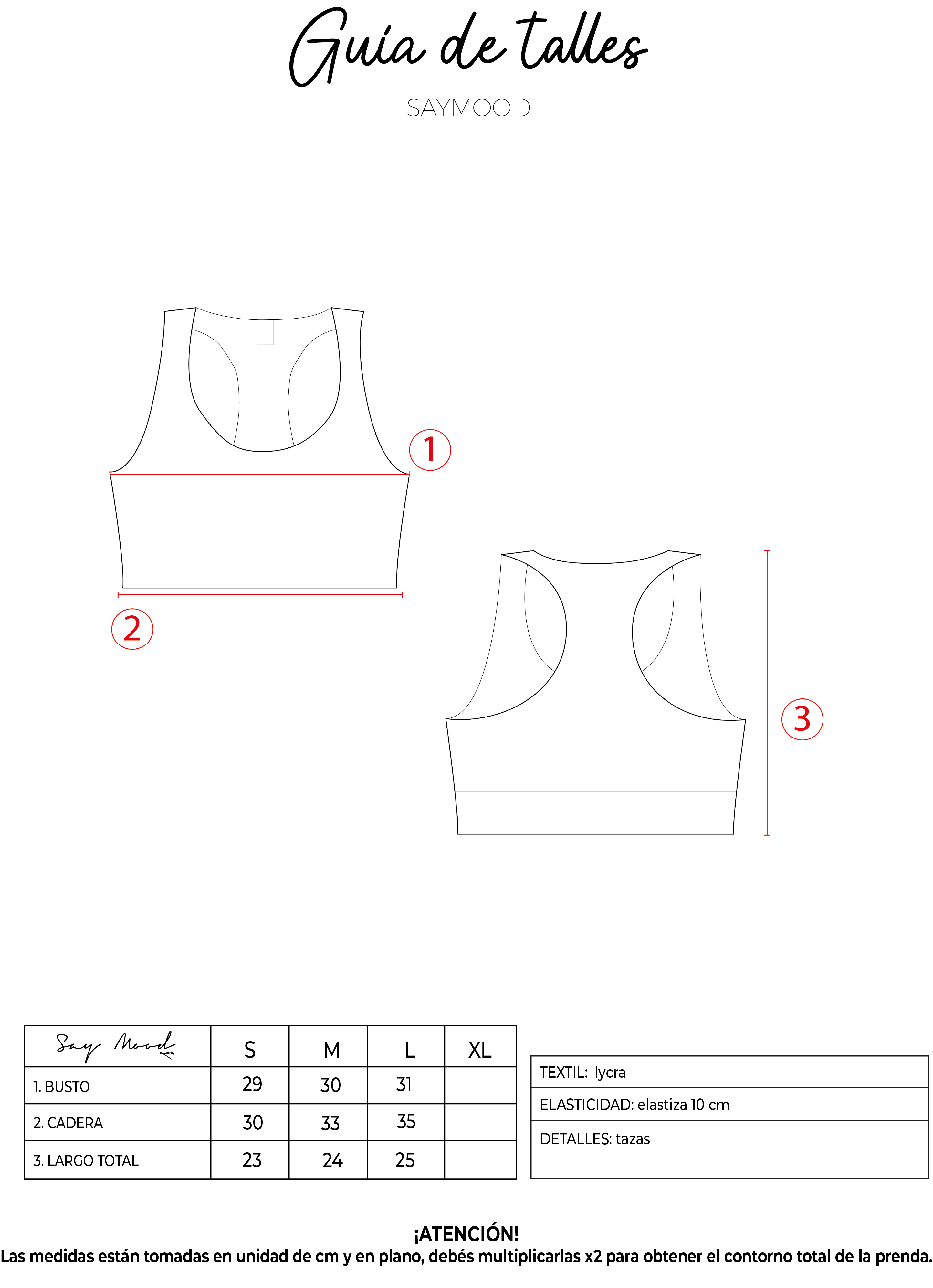 SAYTIPS: chequeá con atención nuestra tabla de talles para encontrar el que mejor vaya con vos. Podés tomar como referencia una prenda similar que tengas para mayor seguridad .