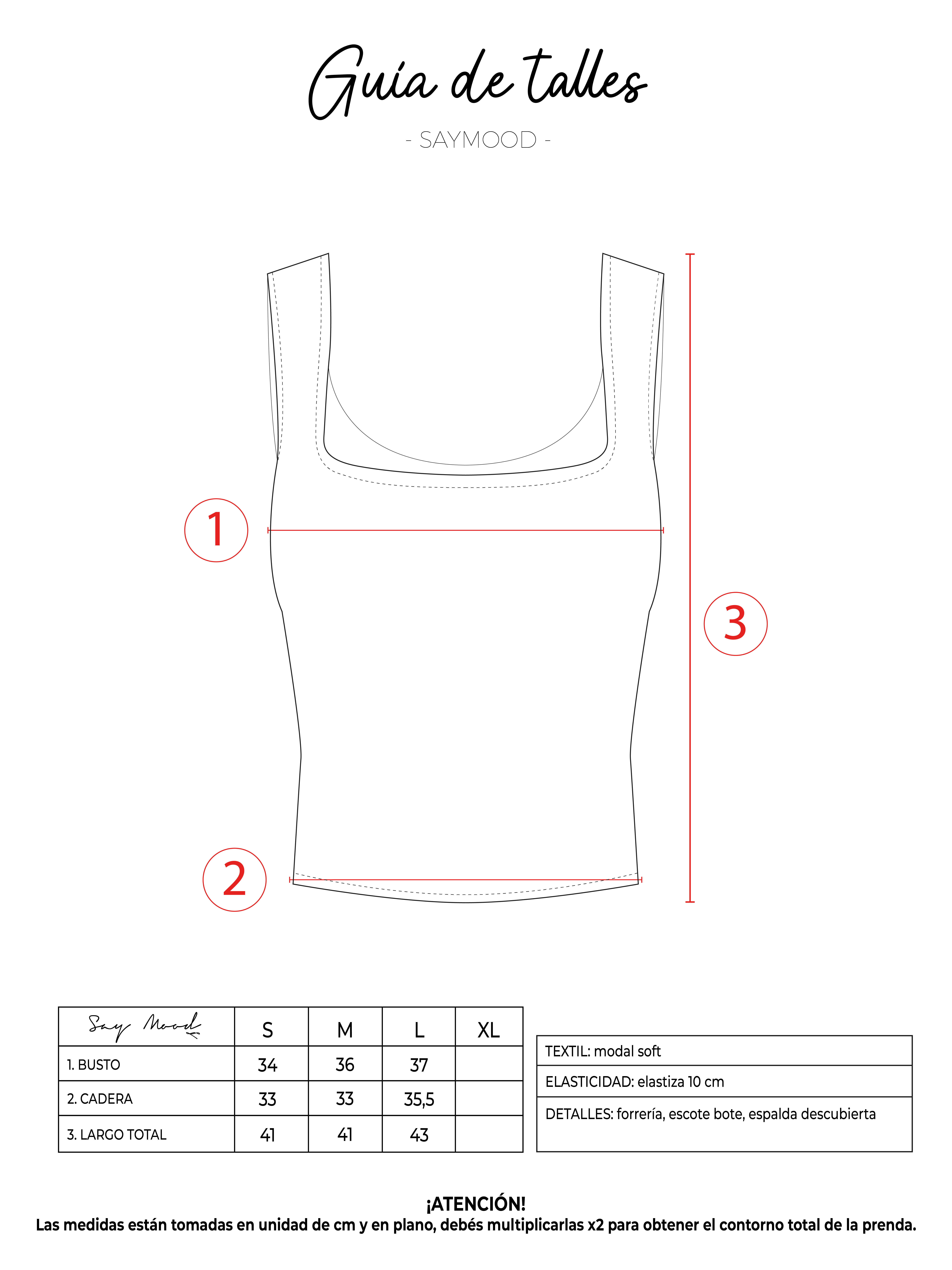 SAYTIPS: chequeá con atención nuestra tabla de talles para encontrar el que mejor vaya con vos. Podés tomar como referencia una prenda similar que tengas para mayor seguridad 😉