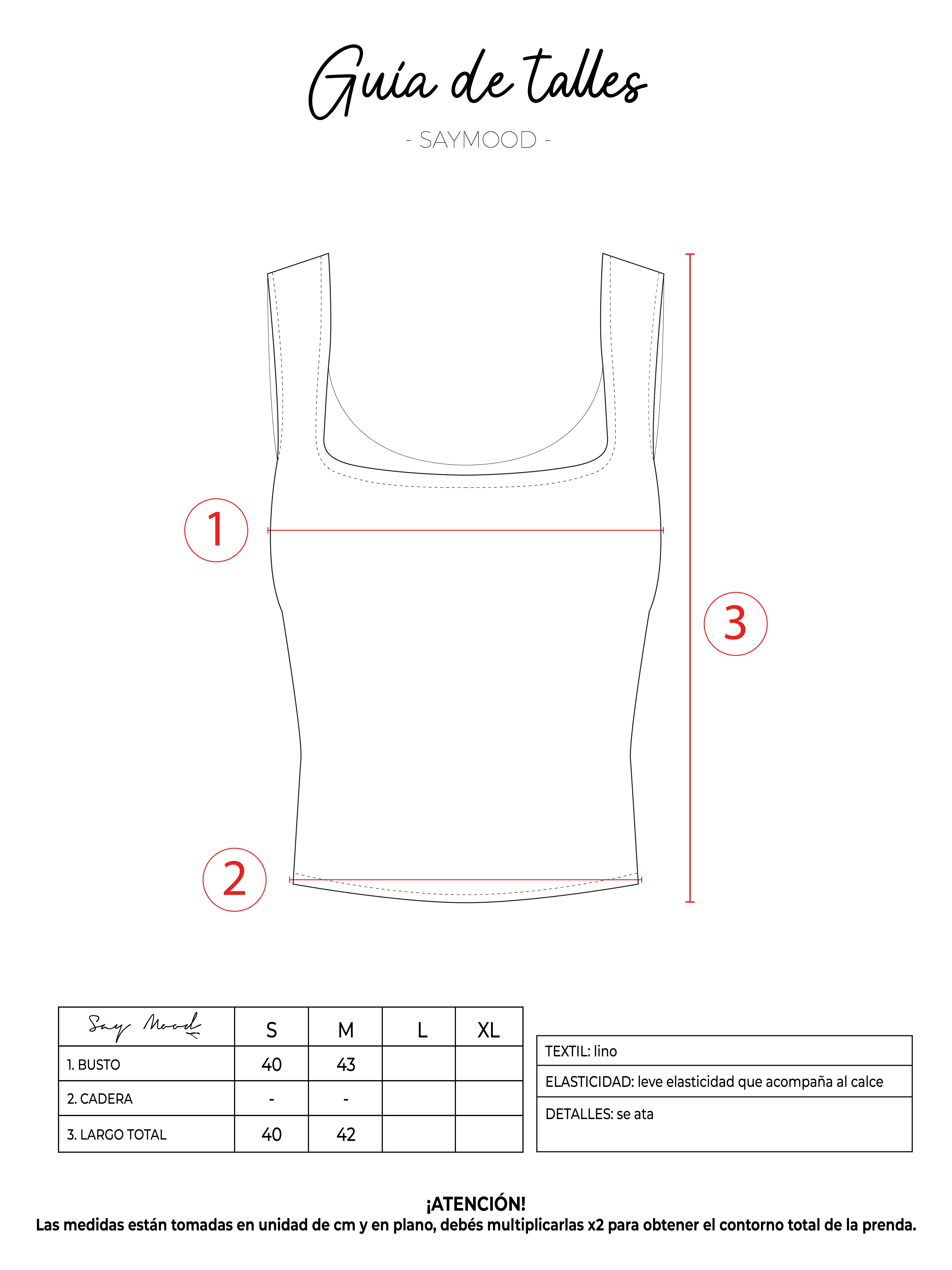 SAYTIPS: chequeá con atención nuestra tabla de talles para encontrar el que mejor vaya con vos. Podés tomar como referencia una prenda similar que tengas para mayor seguridad 😉