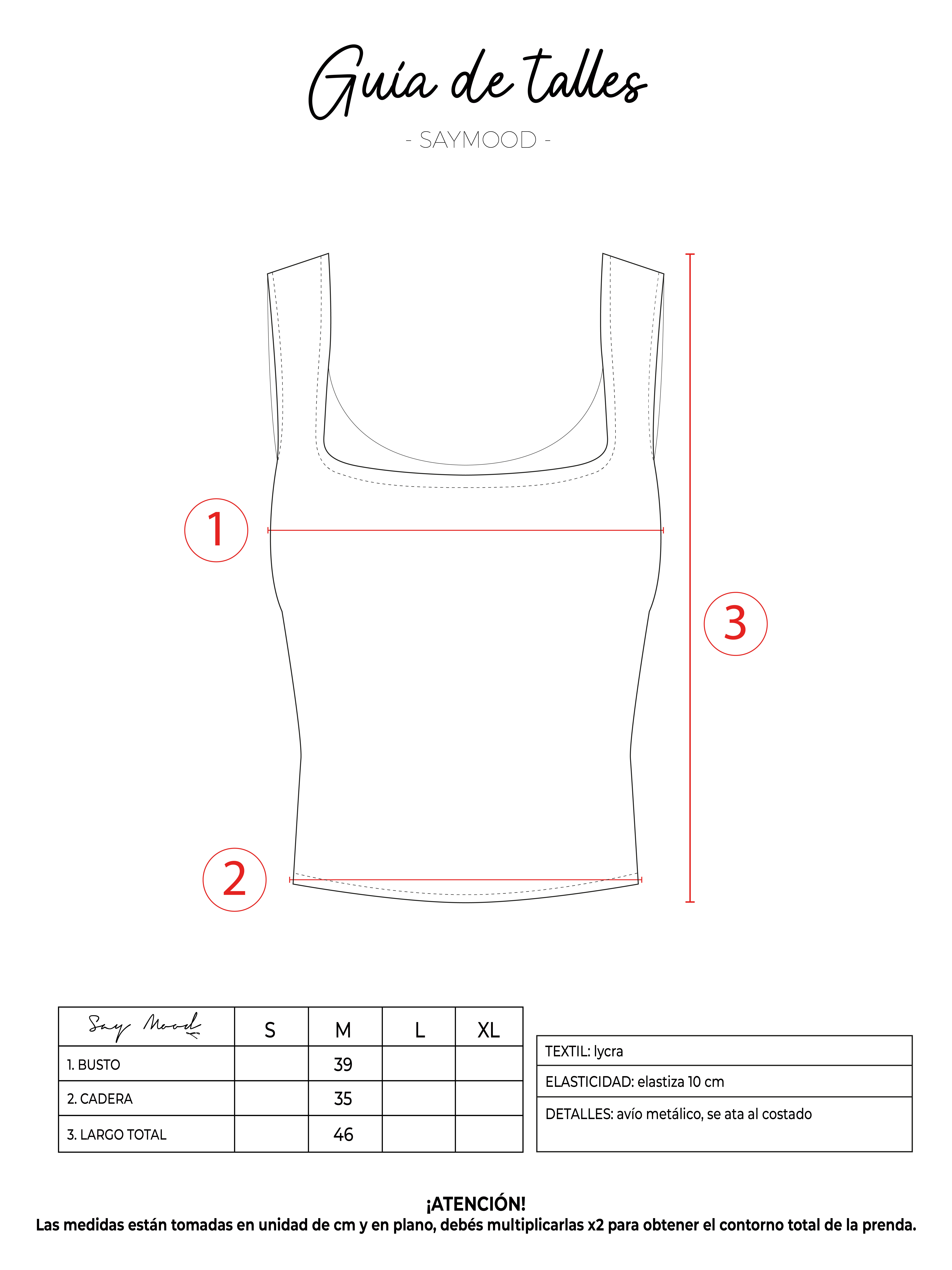 SAYTIPS: chequeá con atención nuestra tabla de talles para encontrar el que mejor vaya con vos. Podés tomar como referencia una prenda similar que tengas para mayor seguridad 😉