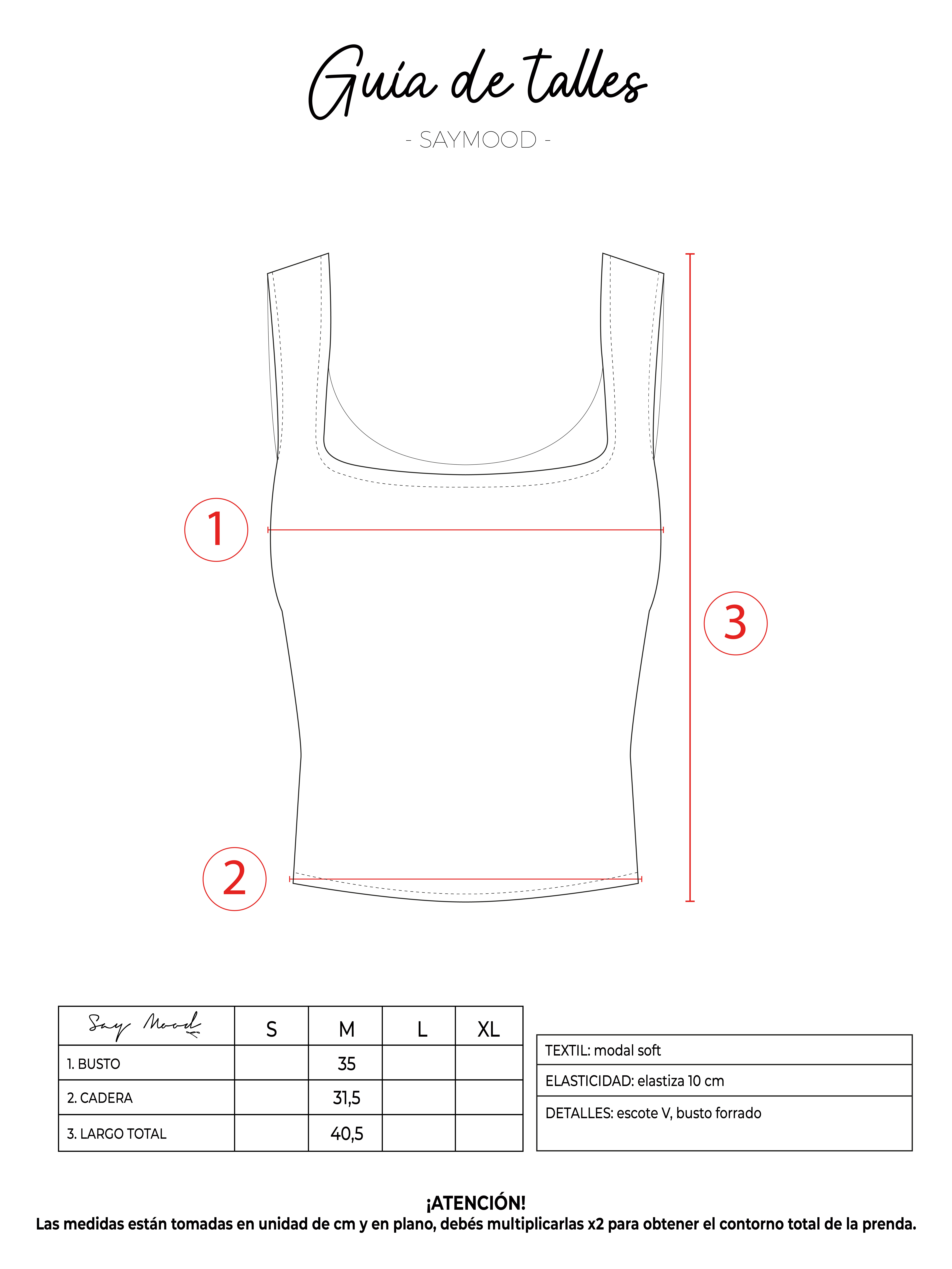 SAYTIPS: chequeá con atención nuestra tabla de talles para encontrar el que mejor vaya con vos. Podés tomar como referencia una prenda similar que tengas para mayor seguridad 😉