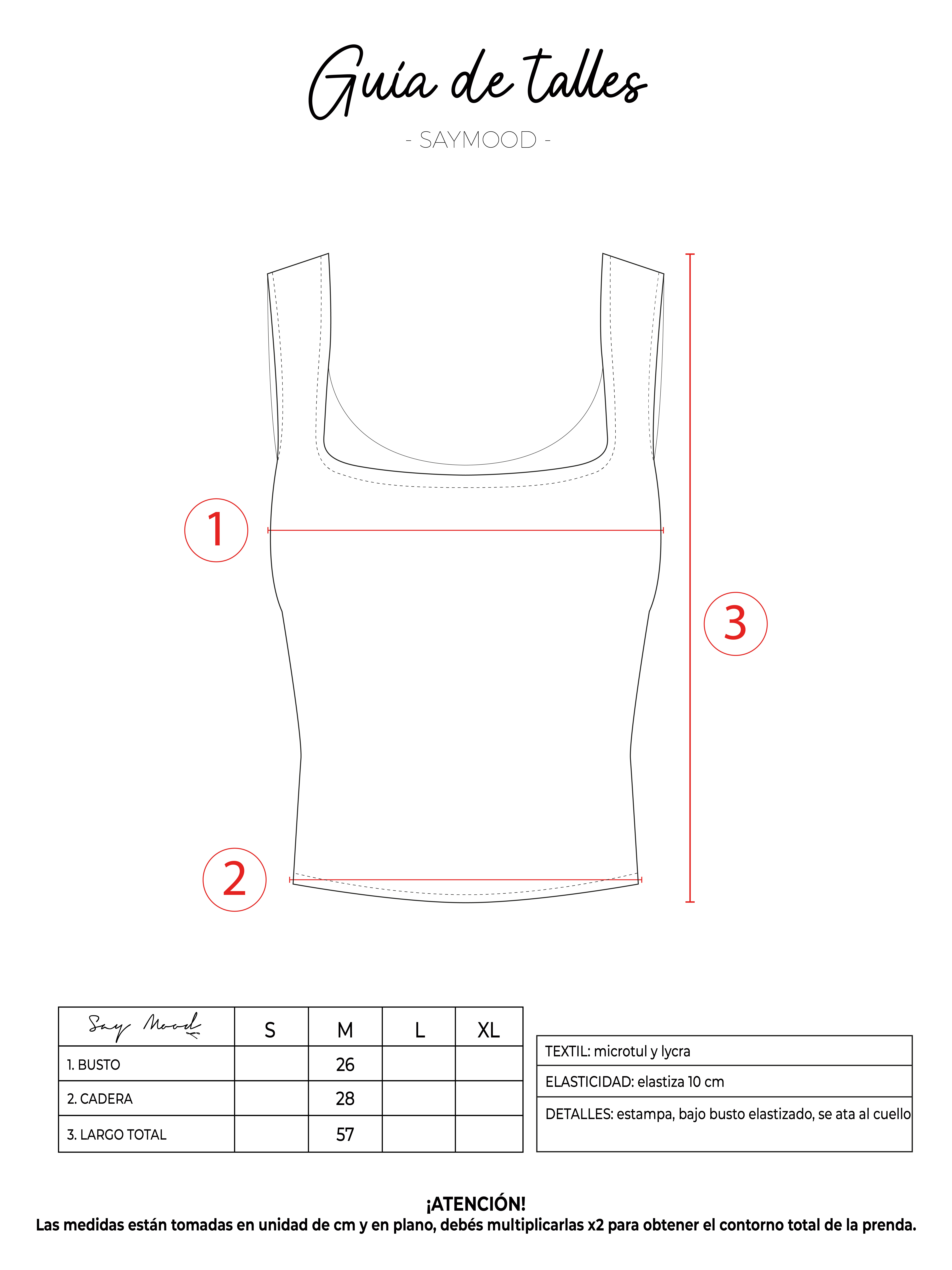 SAYTIPS: chequeá con atención nuestra tabla de talles para encontrar el que mejor vaya con vos. Podés tomar como referencia una prenda similar que tengas para mayor seguridad 😉