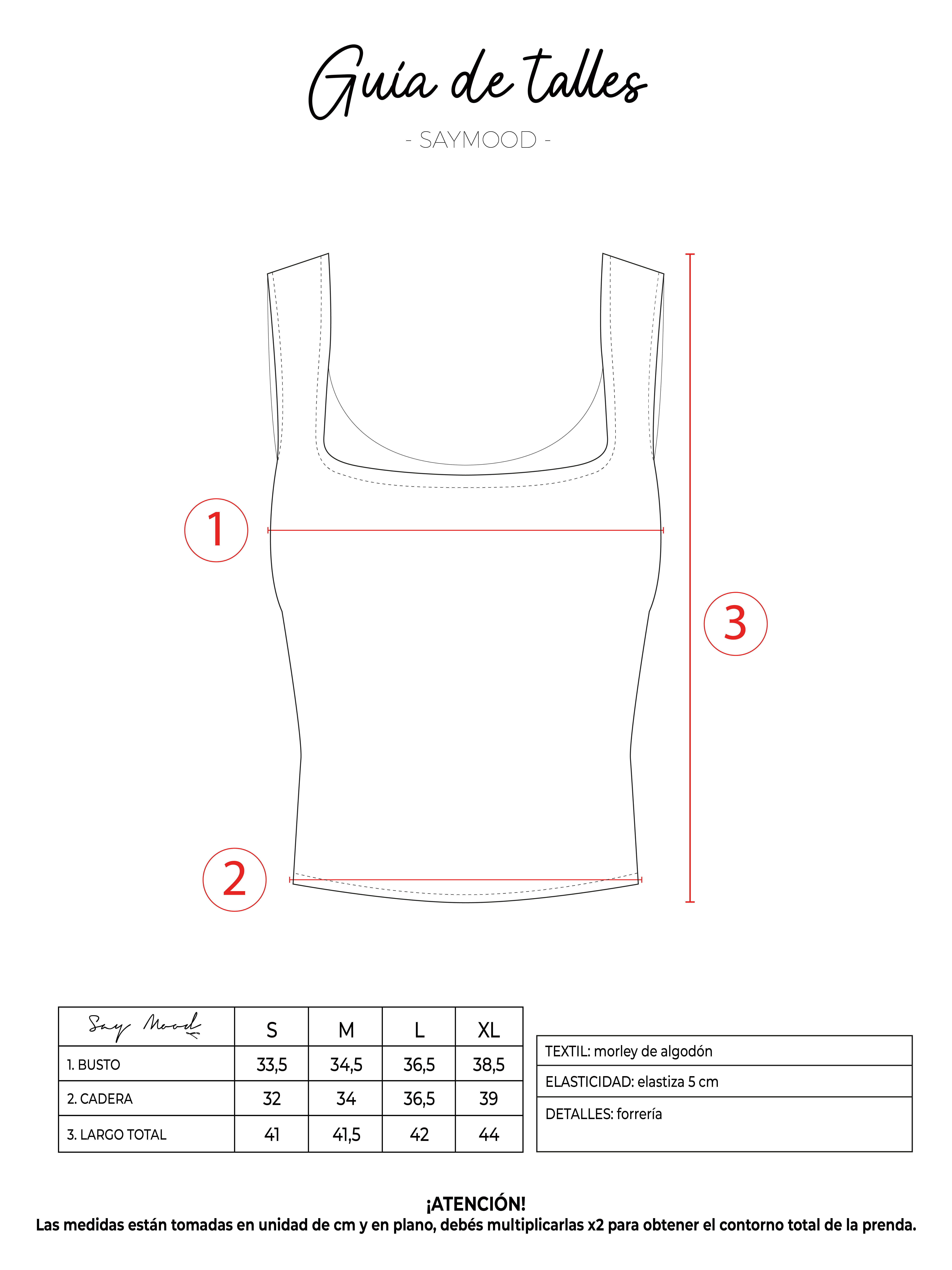 SAYTIPS: chequeá con atención nuestra tabla de talles para encontrar el que mejor vaya con vos. Podés tomar como referencia una prenda similar que tengas para mayor seguridad 😉