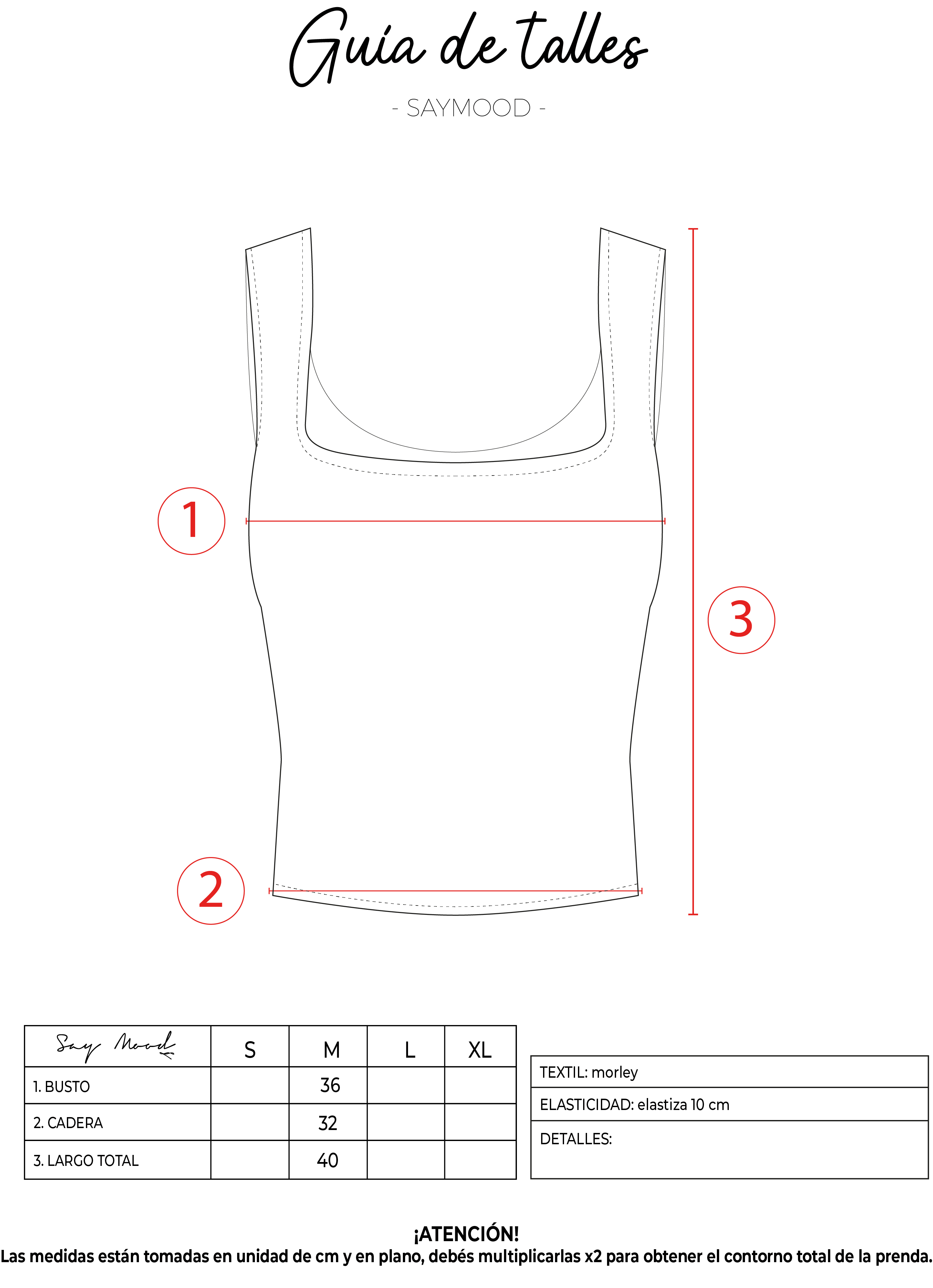 SAYTIPS: chequeá con atención nuestra tabla de talles para encontrar el que mejor vaya con vos. Podés tomar como referencia una prenda similar que tengas para mayor seguridad