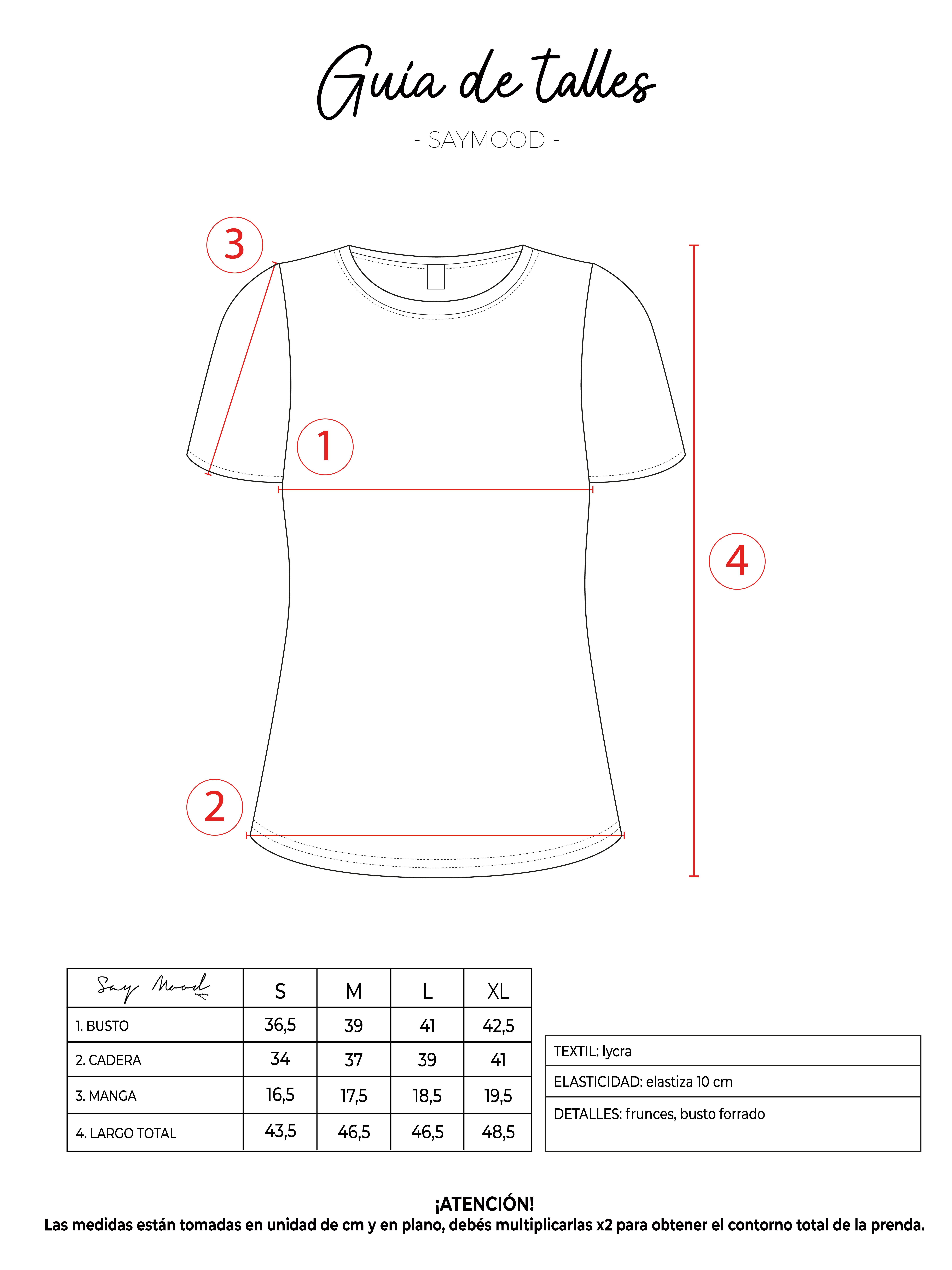 Say Night ✨ un top básico pero en tendencia, ideal para que sea el comodín de tu colección! confeccionado en lycra de primera calidad, elastiza y se adapta a tu figura. Mangas cortas, largo bajo la cintura aprox., con escote redondo forrado y frunces sobre el torso! que suman un detalle trendy ❤️ combinalo de noche con engomado, denim, con sastrería para una ocasión especial y mucho más! mega versátil -