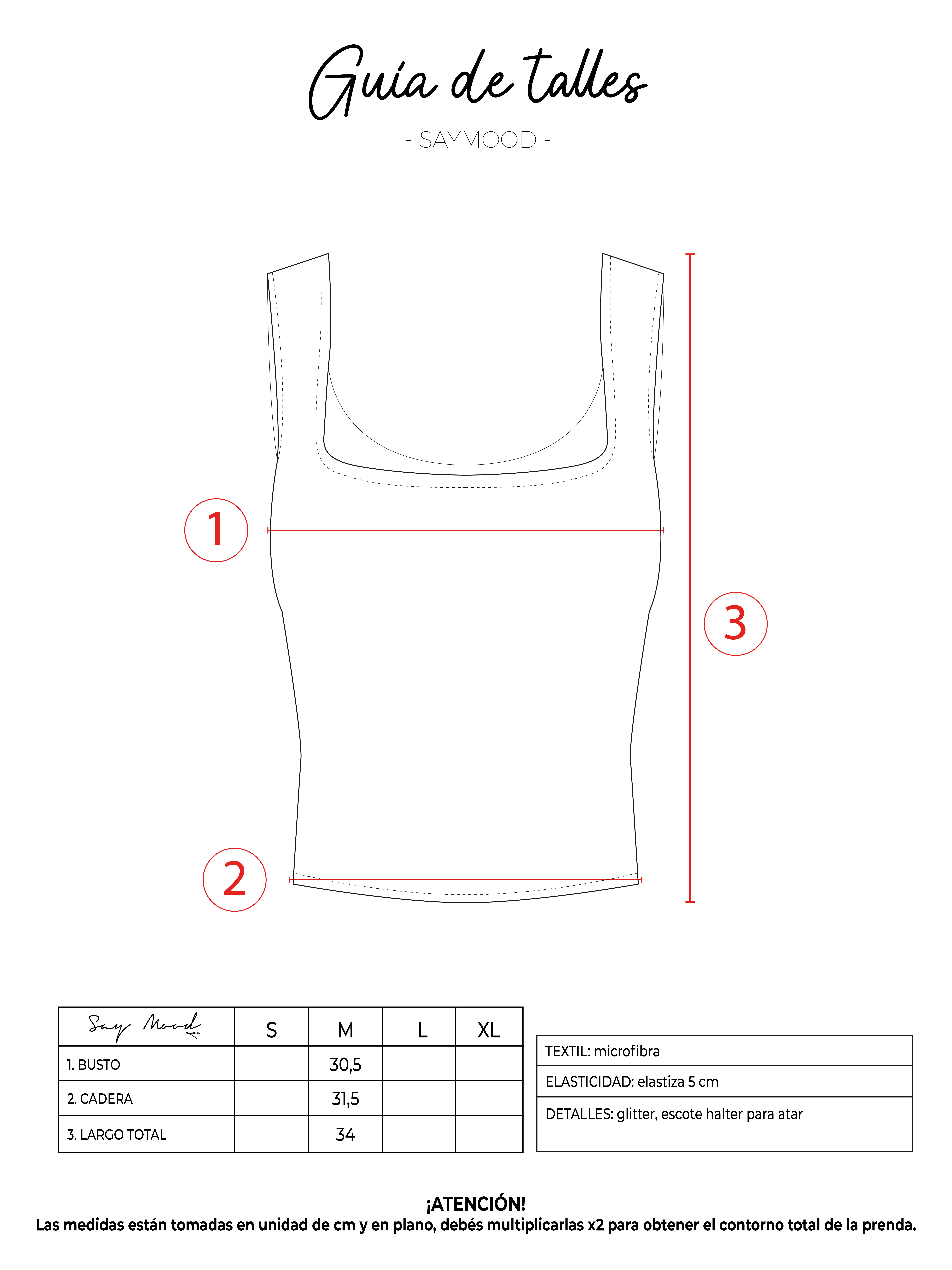 SAYTIPS: chequeá con atención nuestra tabla de talles para encontrar el que mejor vaya con vos. Podés tomar como referencia una prenda similar que tengas para mayor seguridad 😉 hey! te sugerimos lavar esta prenda por separado y guardarla en su empaque original ya que puede desprender glitter.