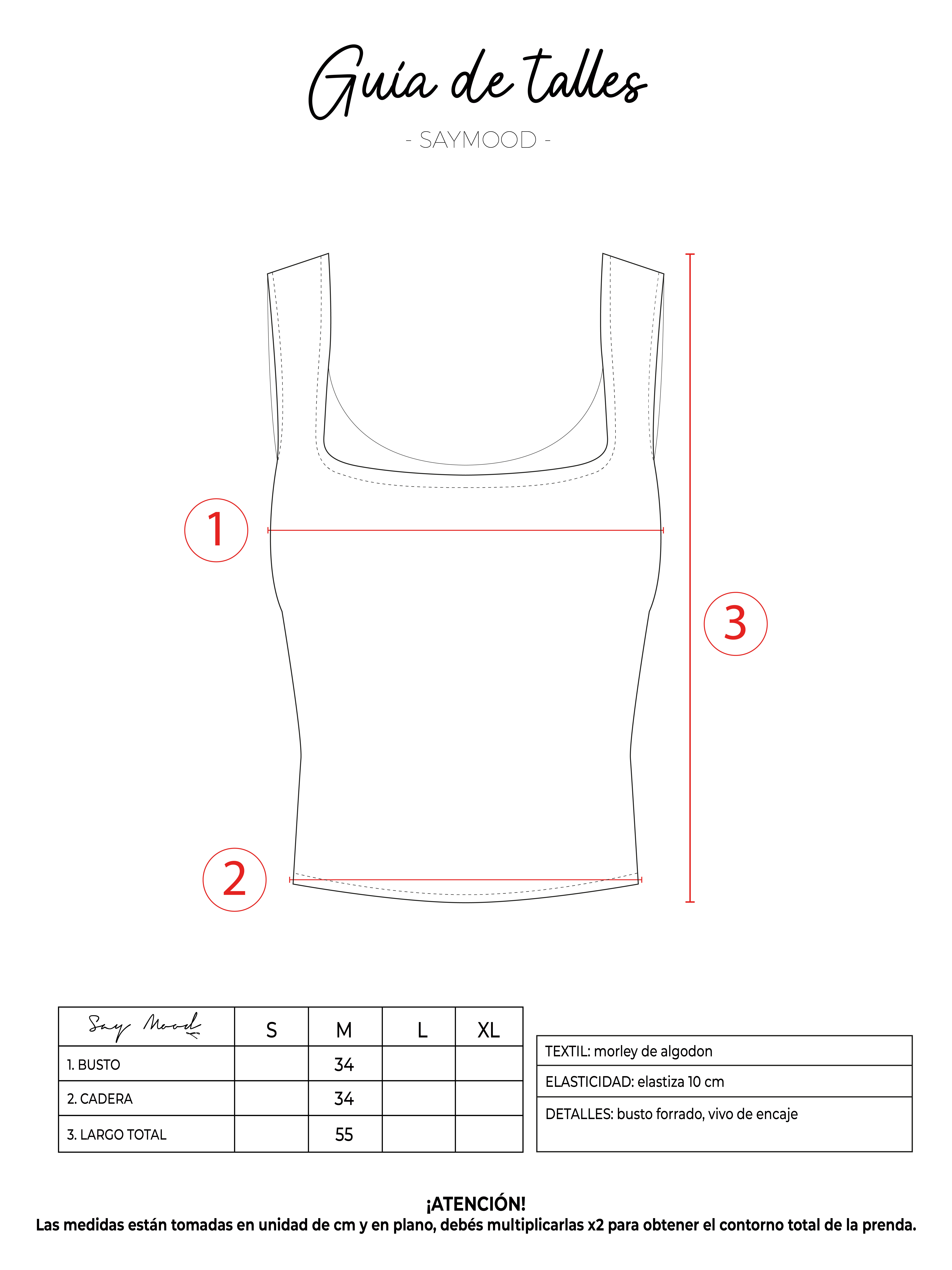 Anticipo de temporada 🤫 de estilo romántico y veraniego, Sicilia toma protagonismo en tu look gracias al calce favorecedor. La silueta es anatómica, con elasticidad, escote halter que se sostiene al cuello, y terminaciones de encaje ❤️ Además, busto forrado y pinzas para que siga tu figura. Confeccionado en morley de algodón de primera calidad, mixea comodidad con un diseño sexy, para que puedas usarlo en looks especiales ❤️ esta es una oportunidad única de anticiparte a los días cálidos -