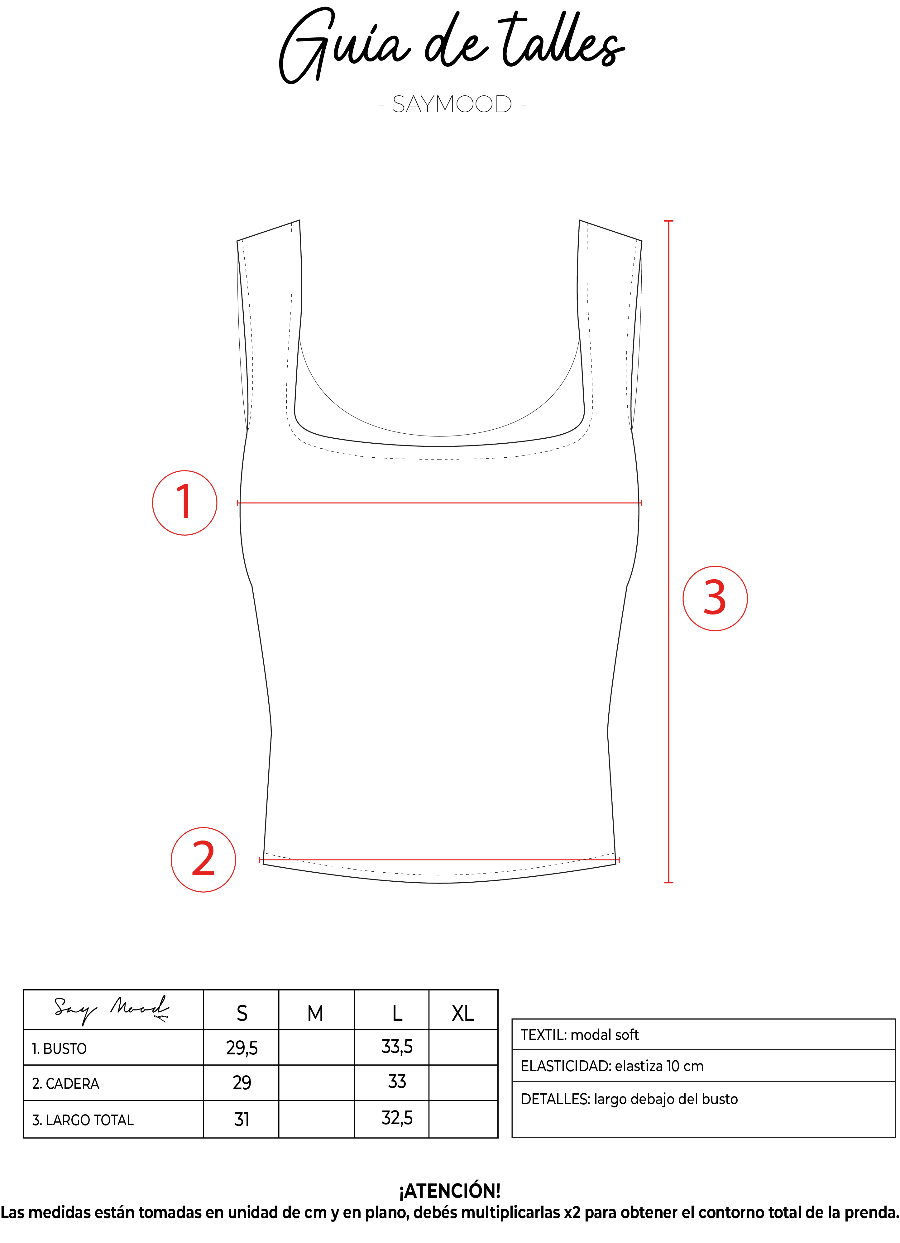 SAYTIPS: chequeá con atención nuestra tabla de talles para encontrar el que mejor vaya con vos. Podés tomar como referencia una prenda similar que tengas para mayor seguridad 😉