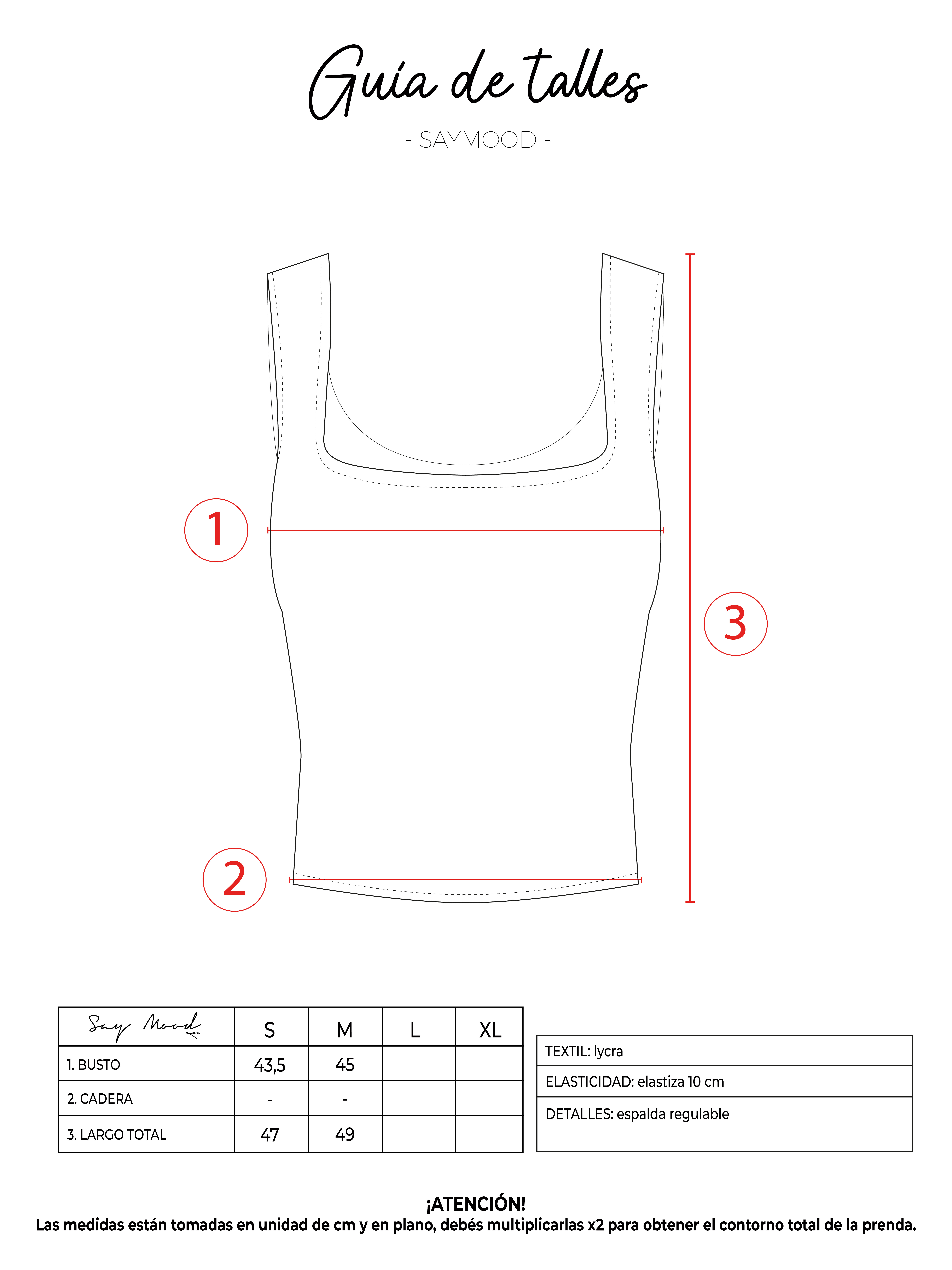 SAYTIPS: chequeá con atención nuestra tabla de talles para encontrar el que mejor vaya con vos. Podés tomar como referencia una prenda similar que tengas para mayor seguridad 😉