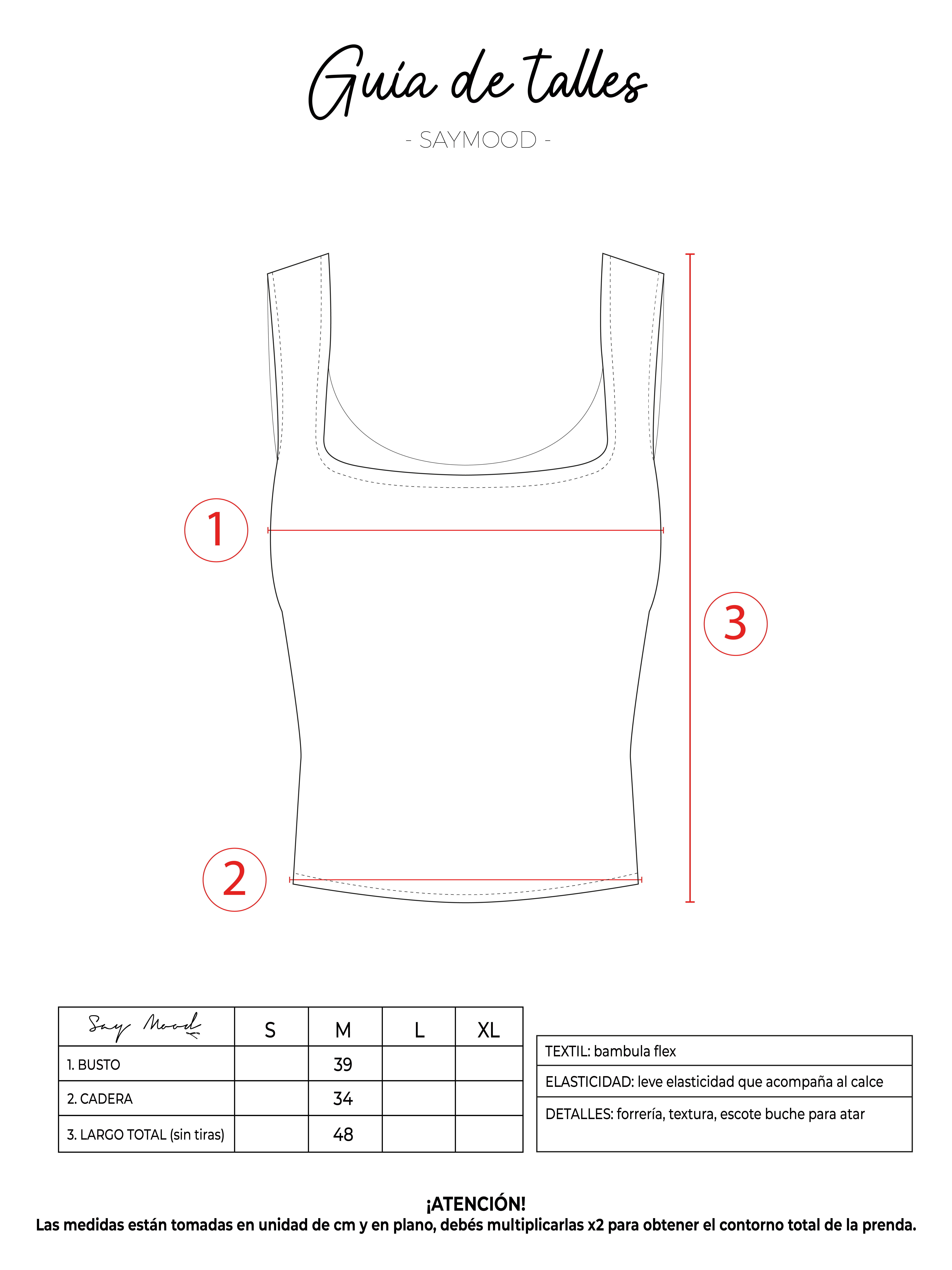 SAYTIPS: chequeá con atención nuestra tabla de talles para encontrar el que mejor vaya con vos. Podés tomar como referencia una prenda similar que tengas para mayor seguridad 😉