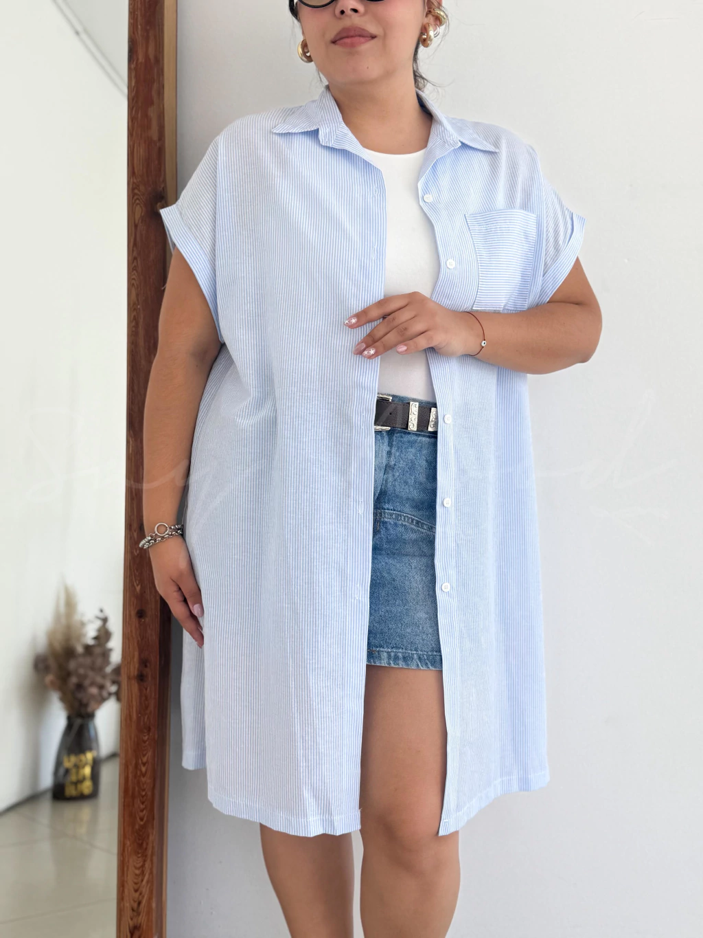 Anticipo de temporada 🤫 para recibir con prendas versátiles la nueva temporada... llegó el vestido que necesitas en tu colección ❤️ La silueta es amplia, liviana, de largo sobre la rodilla aprox., y tajos laterales. El diseño con detalles camiseros aporta un plus canchero y urbano, al mismo tiempo que te viste fresca para días de trabajo u ocasiones formales ✨ es una musculosa con hombros caídos... eso significa que no tiene sisa y así se adapta a tu espalda y busto ✨ Confeccionado en poplin camisero + trama a rayas que nunca pasa de moda -