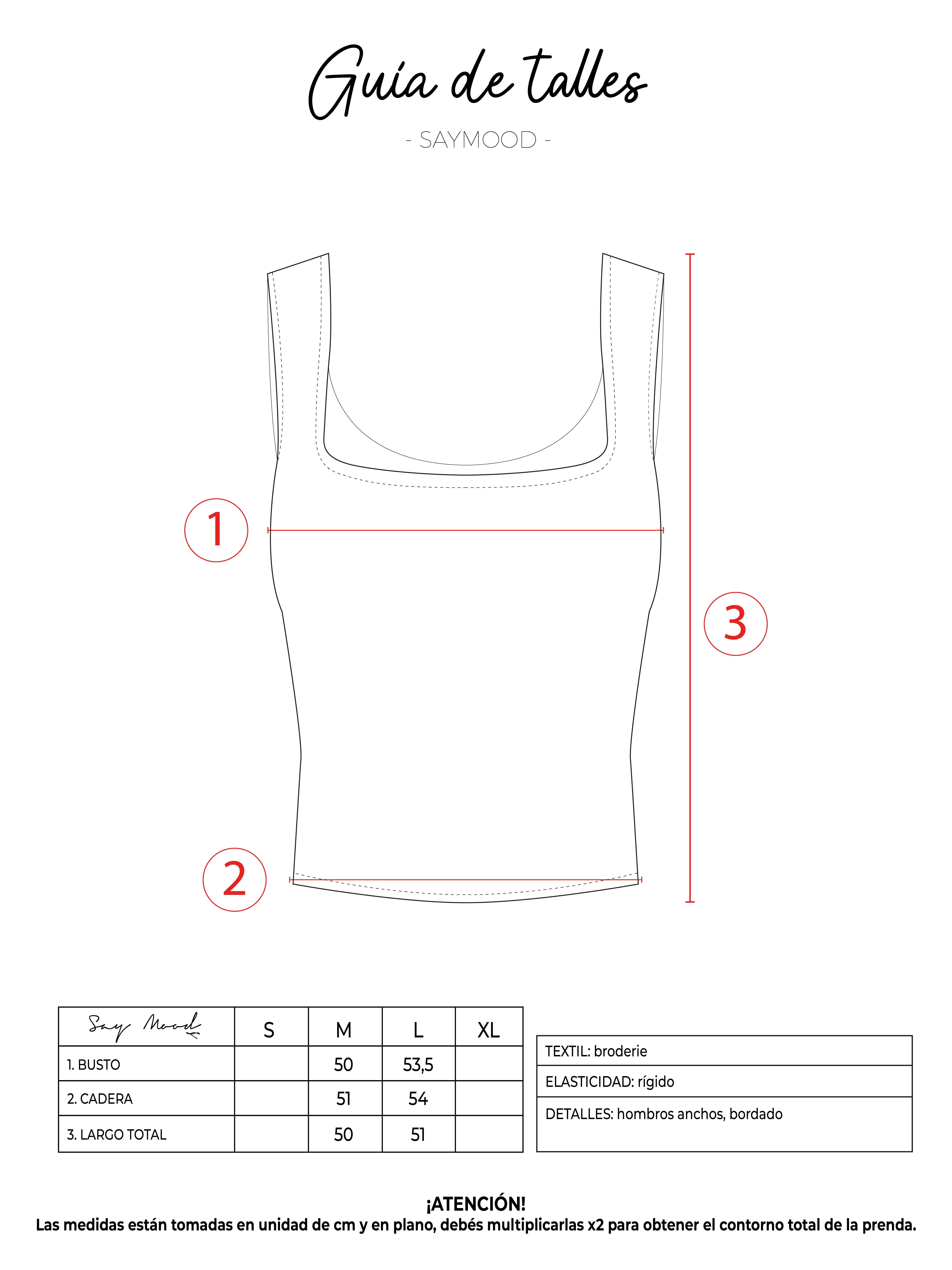 SAYTIPS: chequeá con atención nuestra tabla de talles para encontrar el que mejor vaya con vos. Podés tomar como referencia una prenda similar que tengas para mayor seguridad 😉