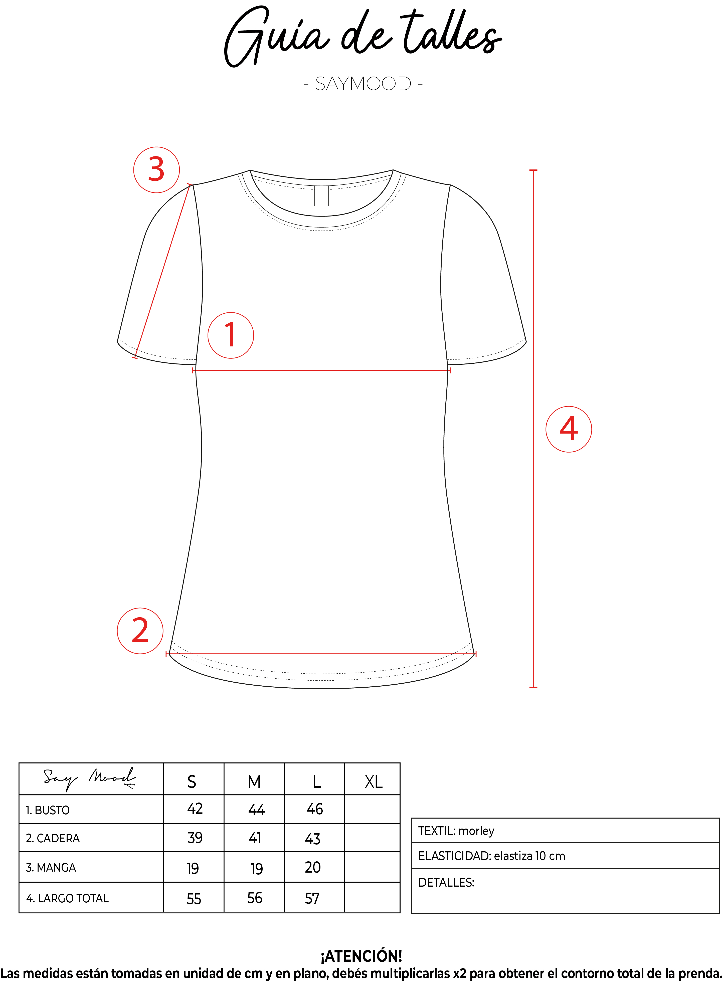 SAYTIPS: chequeá con atención nuestra tabla de talles para encontrar el que mejor vaya con vos. Podés tomar como referencia una prenda similar que tengas para mayor seguridad.