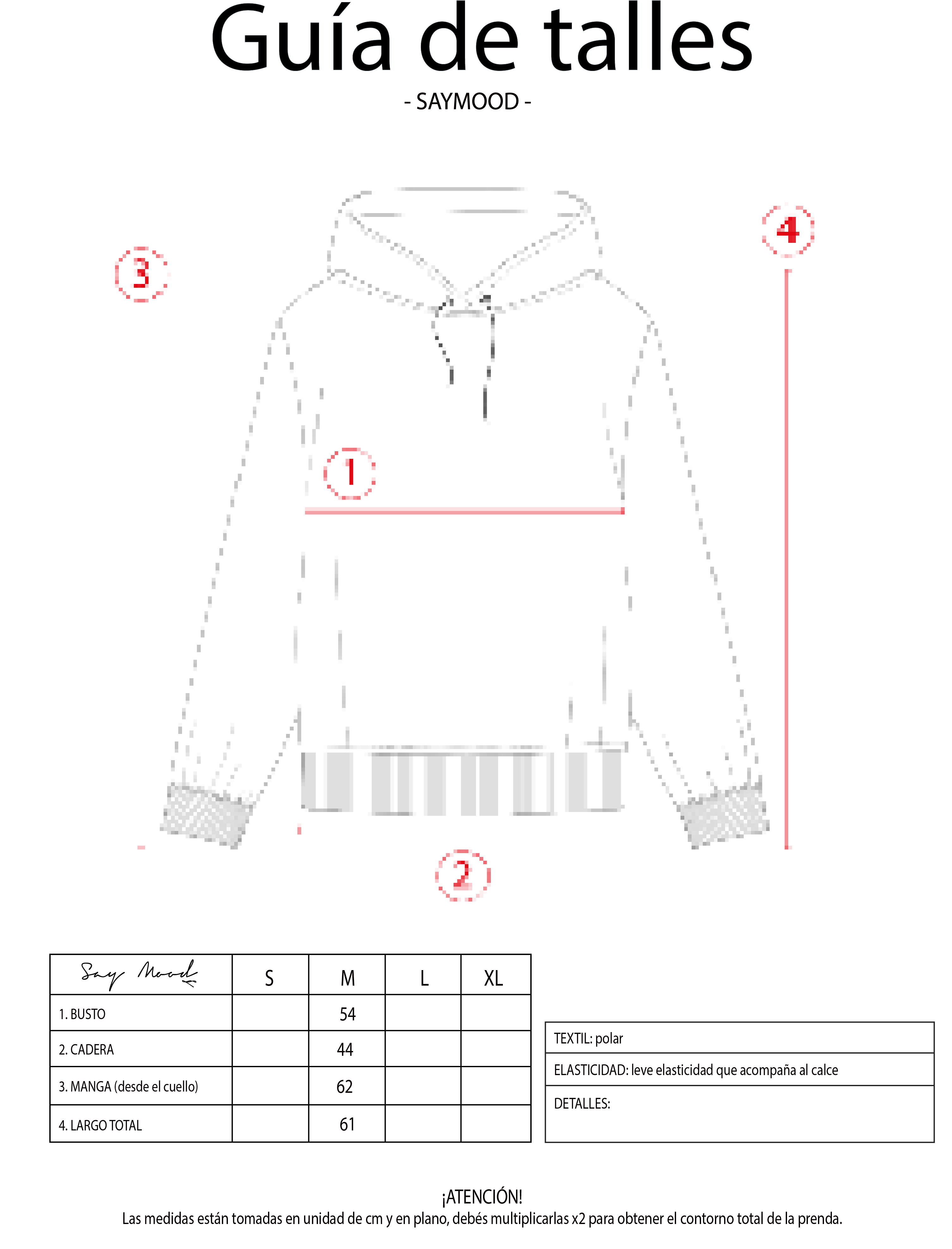 SAYTIPS: chequeá con atención nuestra tabla de talles para encontrar el que mejor vaya con vos. Podés tomar como referencia una prenda similar que tengas para mayor seguridad 😉