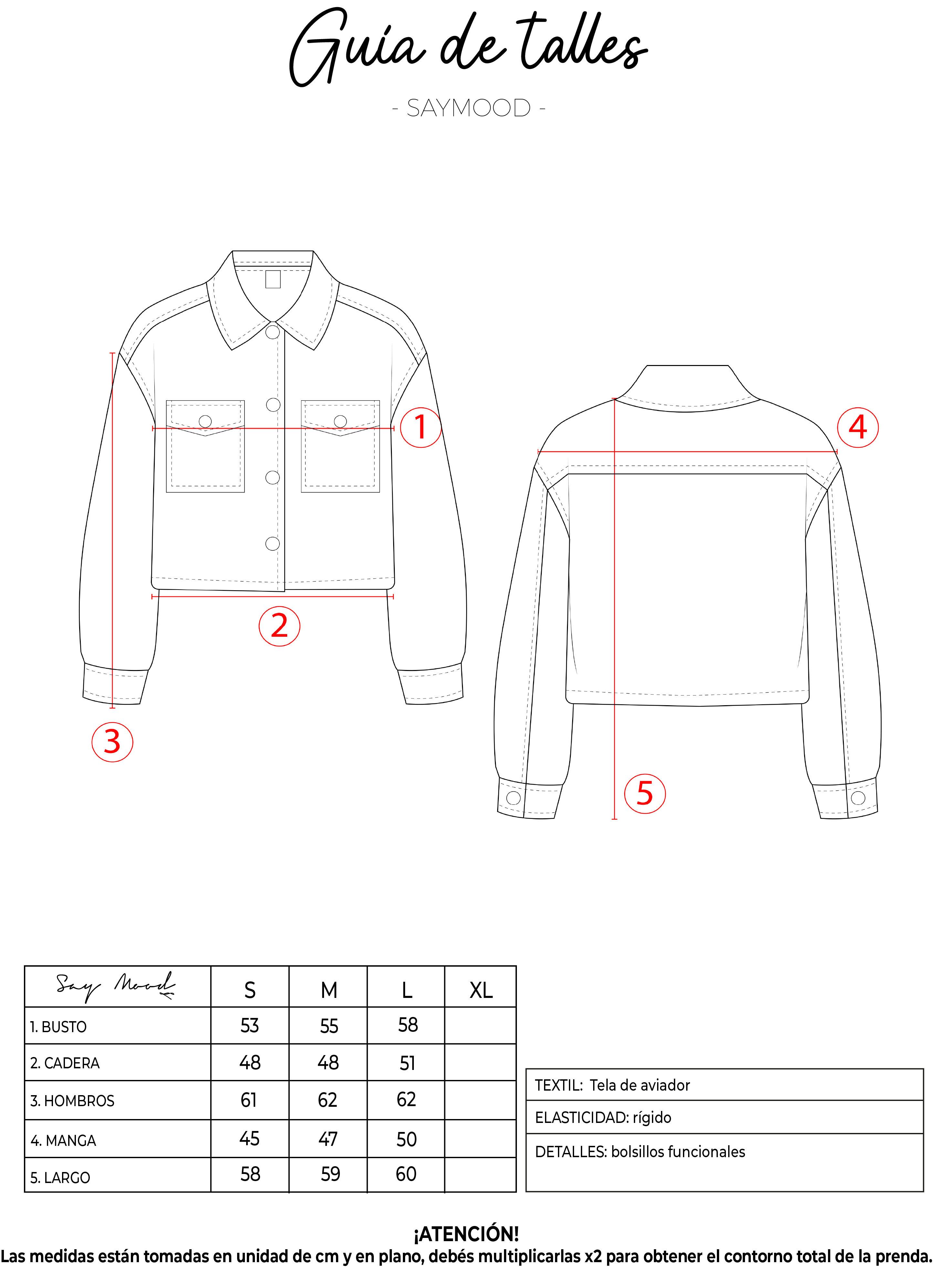 SAYTIPS: chequeá con atención nuestra tabla de talles para encontrar el que mejor vaya con vos. Podés tomar como referencia una prenda similar que tengas para mayor seguridad.