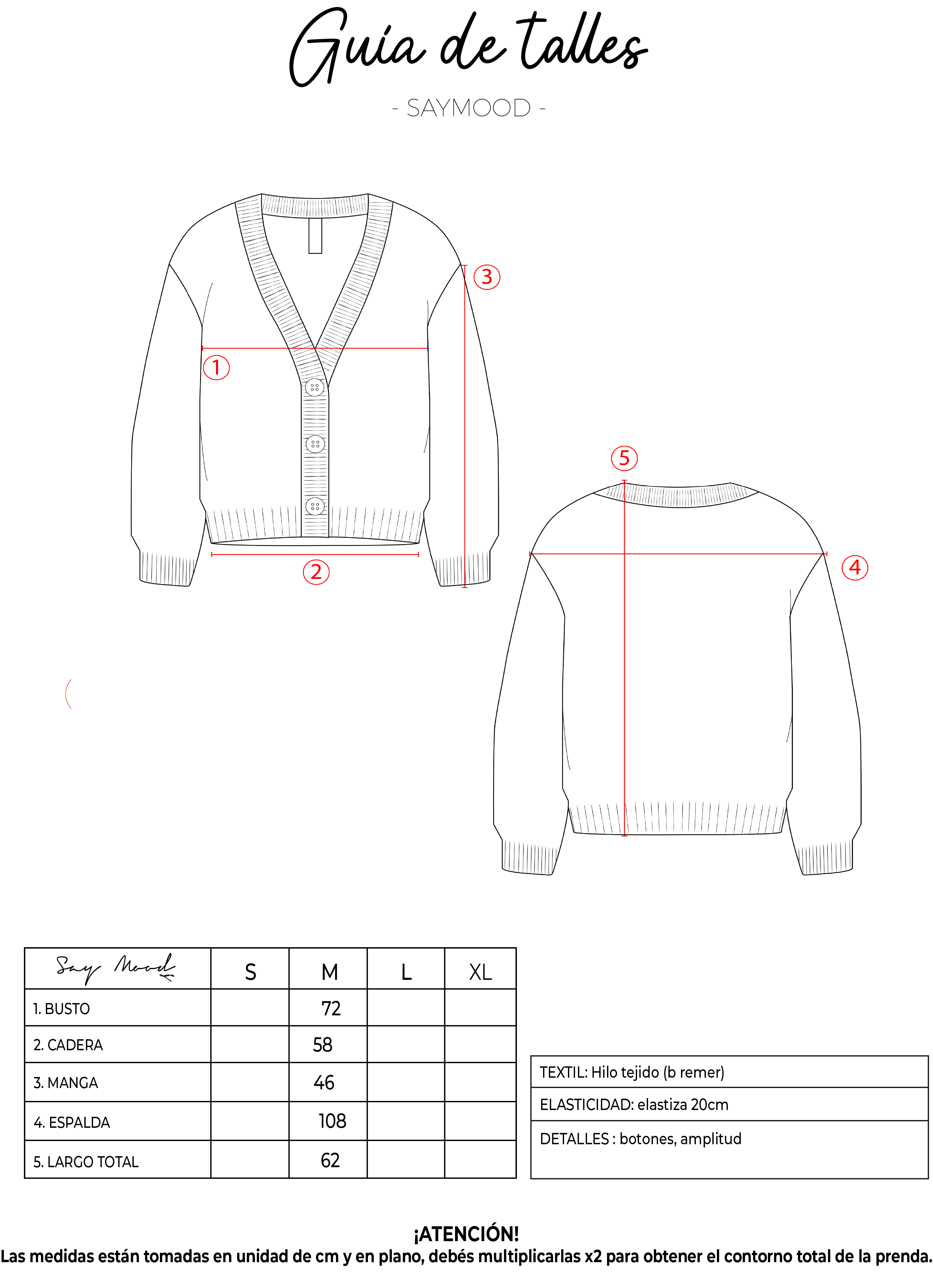 SAYTIPS: chequeá con atención nuestra tabla de talles para encontrar el que mejor vaya con vos. Podés tomar como referencia una prenda similar que tengas para mayor seguridad 😉