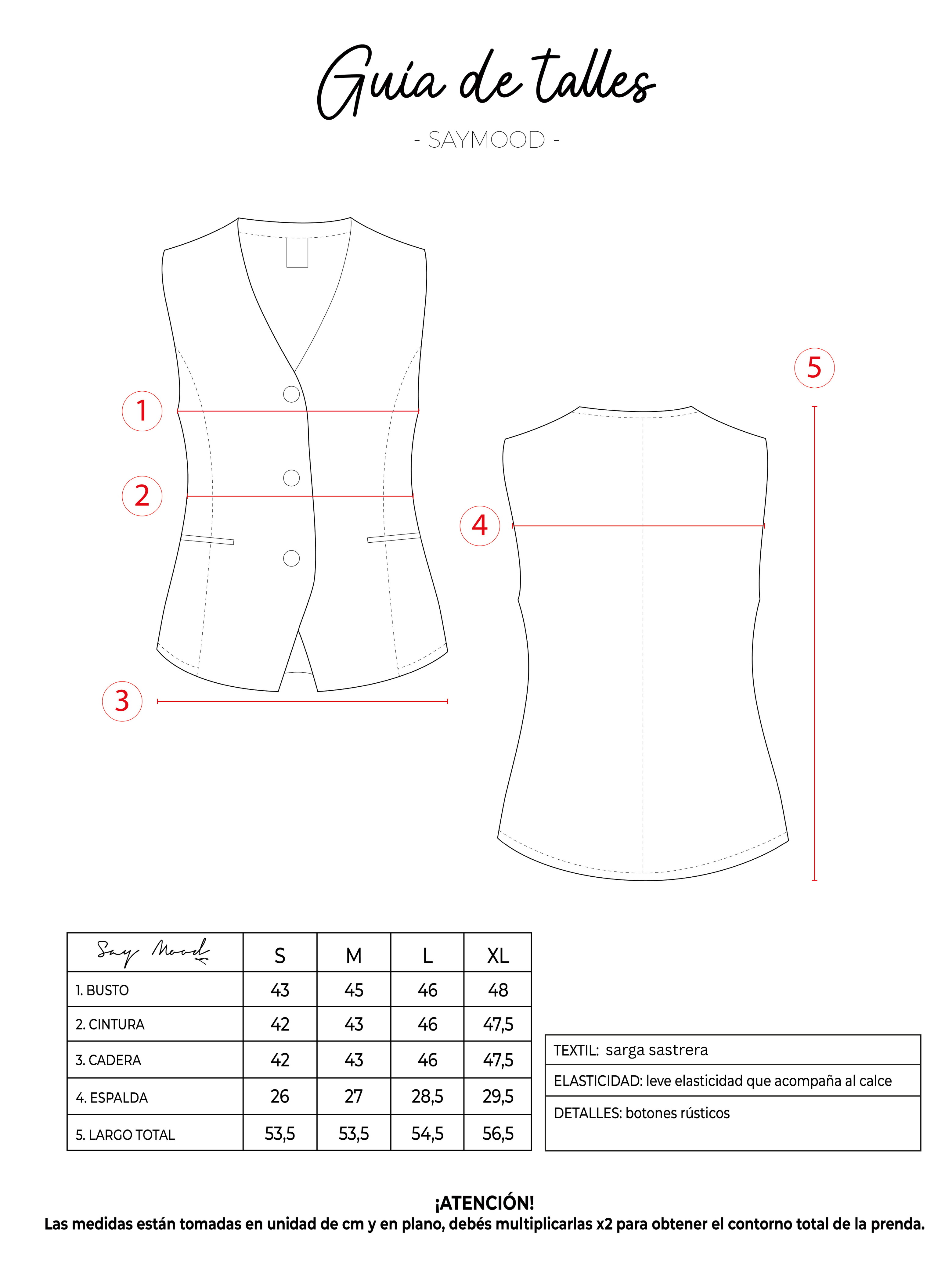 SAYTIPS: chequeá con atención nuestra tabla de talles para encontrar el que mejor vaya con vos. Podés tomar como referencia una prenda similar que tengas para mayor seguridad 😉