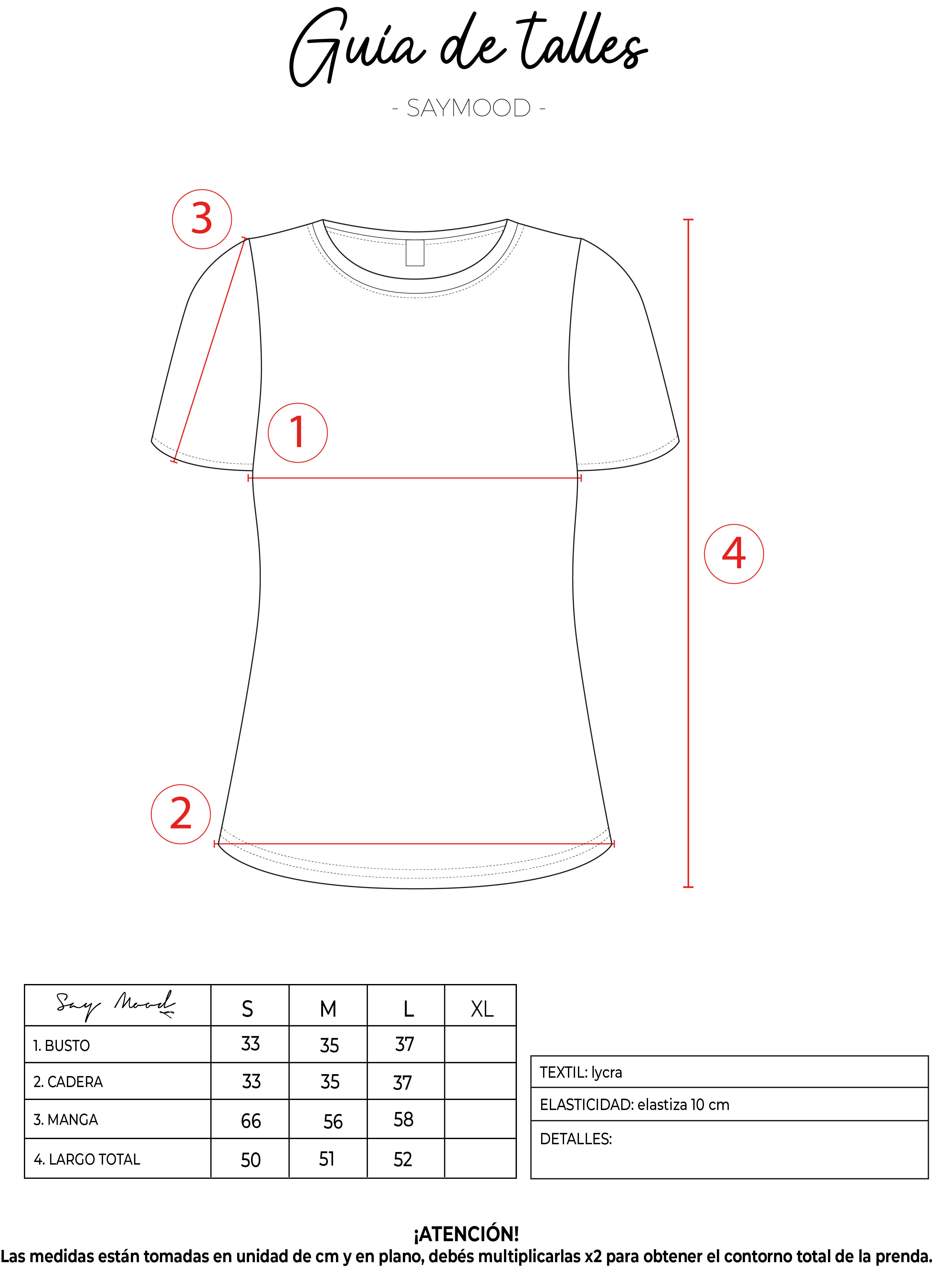 SAYTIPS: chequeá con atención nuestra tabla de talles para encontrar el que mejor vaya con vos. Podés tomar como referencia una prenda similar que tengas para mayor seguridad.