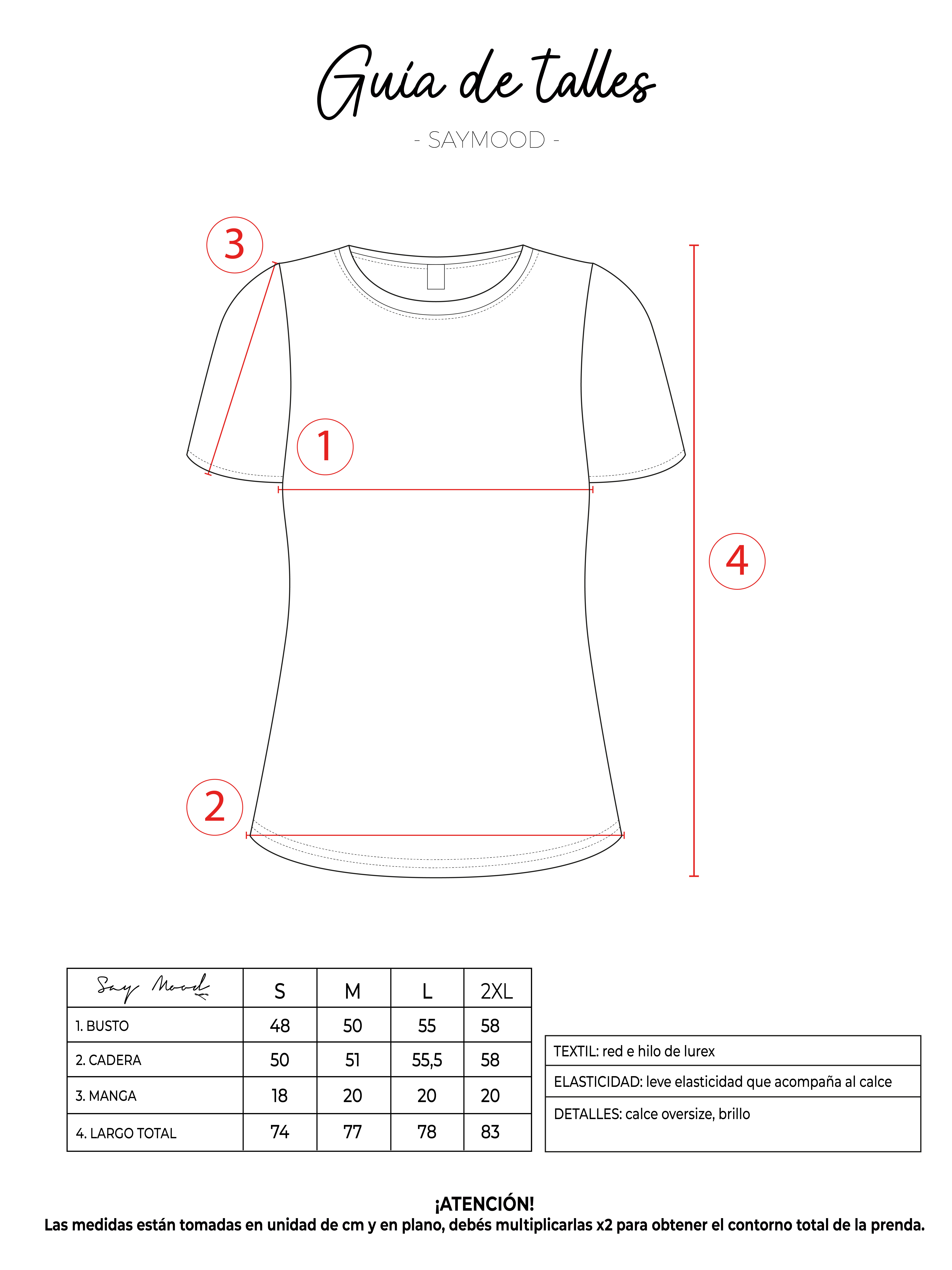 SAYTIPS: chequeá con atención nuestra tabla de talles para encontrar el que mejor vaya con vos. Podés tomar como referencia una prenda similar que tengas para mayor seguridad 😉 hey! la modelo viste otras prenda bajo el remeron, no están incluidas en este producto.