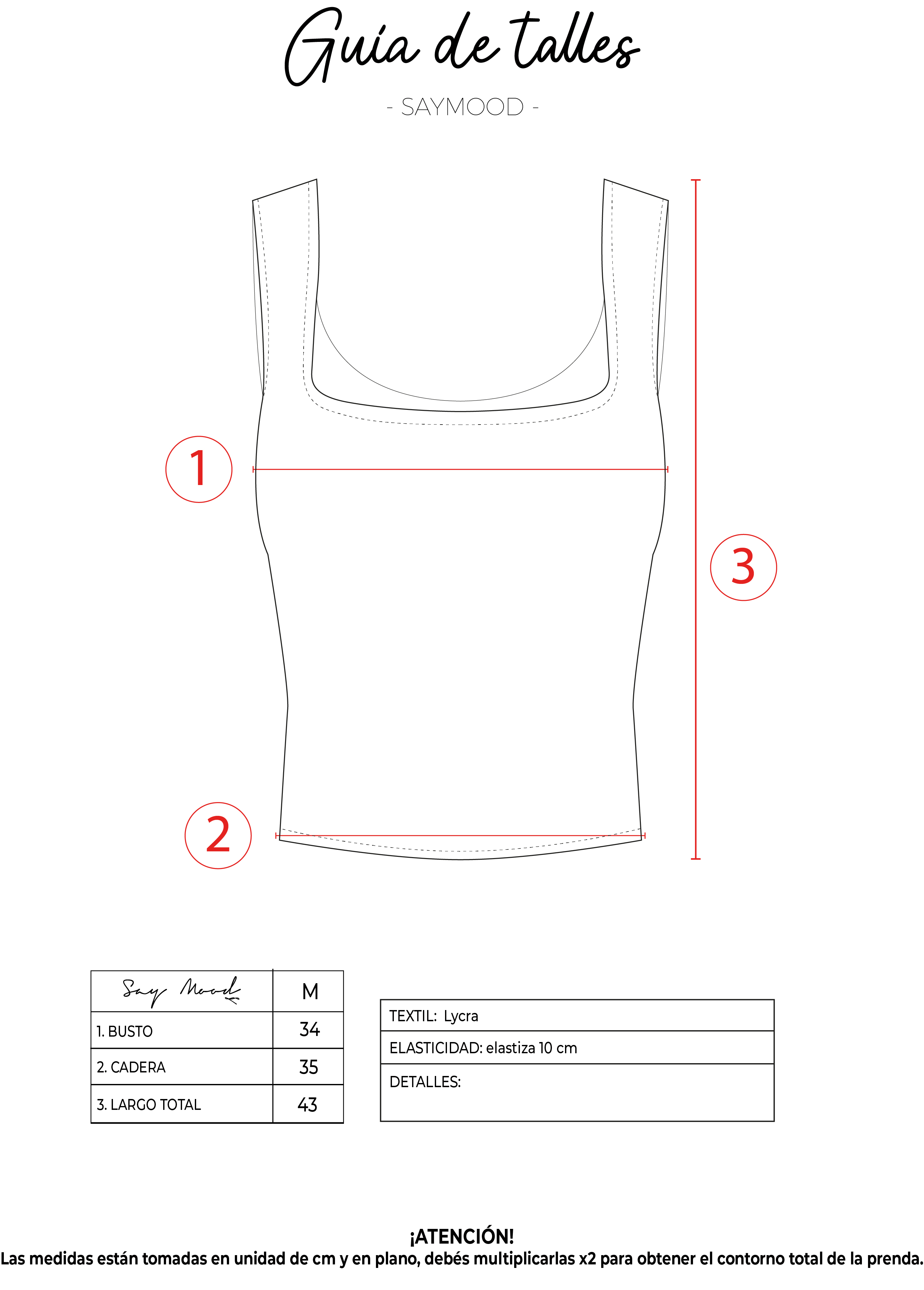 SAYTIPS: chequeá con atención nuestra tabla de talles para encontrar el que mejor vaya con vos. Podés tomar como referencia una prenda similar que tengas para mayor seguridad.